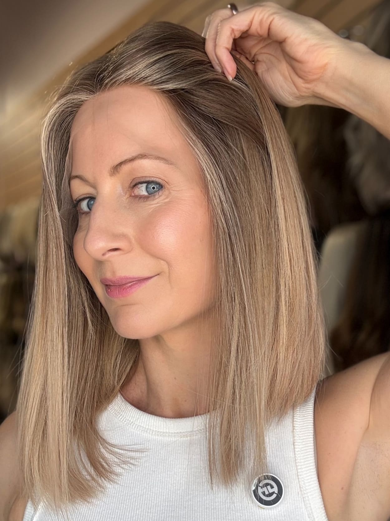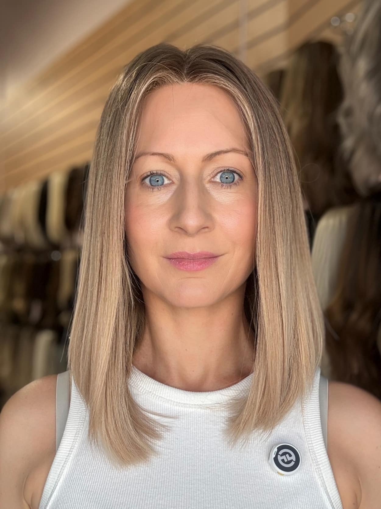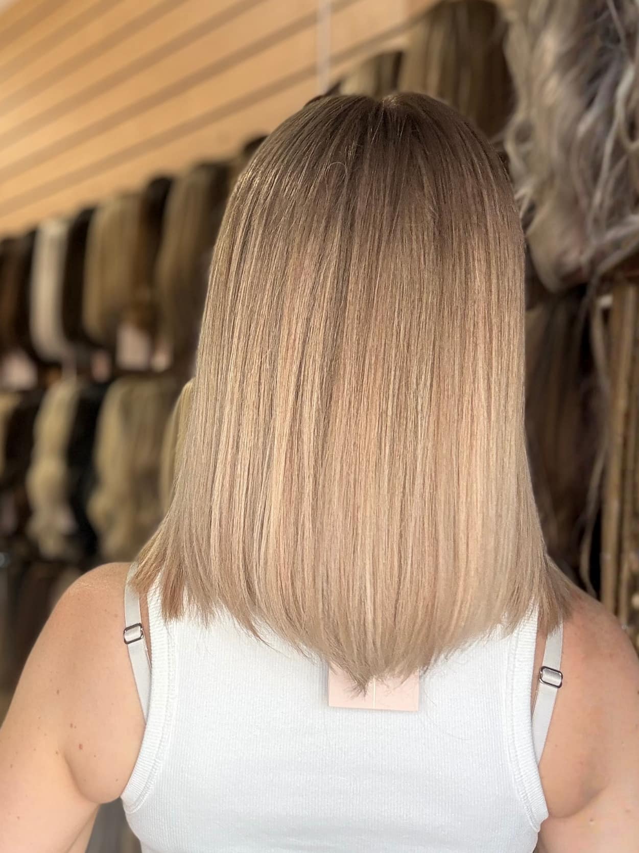 This colour features a soft, mousy dark blonde root that is stretched and seamlessly blended into beige, creamy light blonde ends. The gradual transition creates a natural, lived-in effect, mimicking a soft balayage. The beige and creamy tones add warmth and brightness. The result is a soft, effortless blonde with a beautifully blended, natural finish.