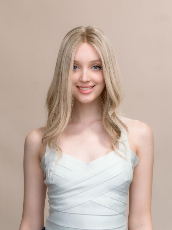 A soft blonde base enhanced with ultra-light highlights for a luminous, sun-kissed finish. The lace top pony wig design creates a natural hairline and comfortable, breathable fit. Made from premium remy human hair, it can be tied up, parted anywhere, and styled with hot tools — beautifully natural and ready to wear.