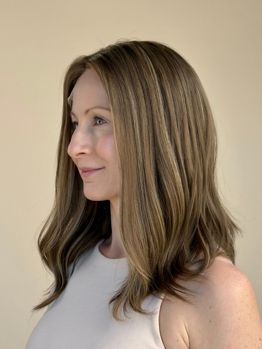 This hand-tied wig is perfect for those who prefer a flatter, more natural-looking hairline, as the construction allows it to sit smoothly and blend effortlessly. The shade features a matte light brunette base with delicate golden highlights that add gentle warmth and soft dimension. With its fully hand-tied cap, lightweight feel, and low-density design, it offers exceptional comfort, natural movement, and seamless realism — ideal for everyday wear with an understated, polished finish.