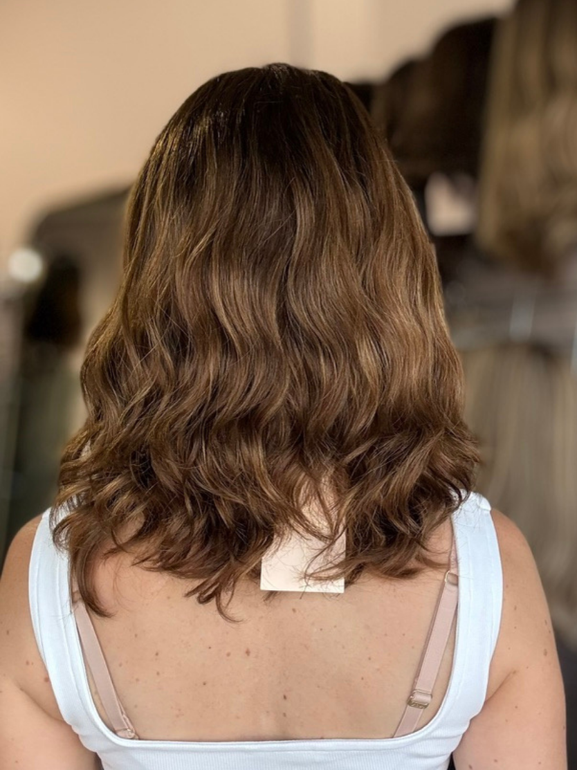 A rich, warm-toned brunette infused with cinnamon hues, this shade has a soft, spicy warmth that enhances depth. Delicate golden highlights are finely woven throughout, adding brightness and a subtle sun-kissed effect. The result is a dimensional, warm brunette with natural movement and a rich, inviting glow.
