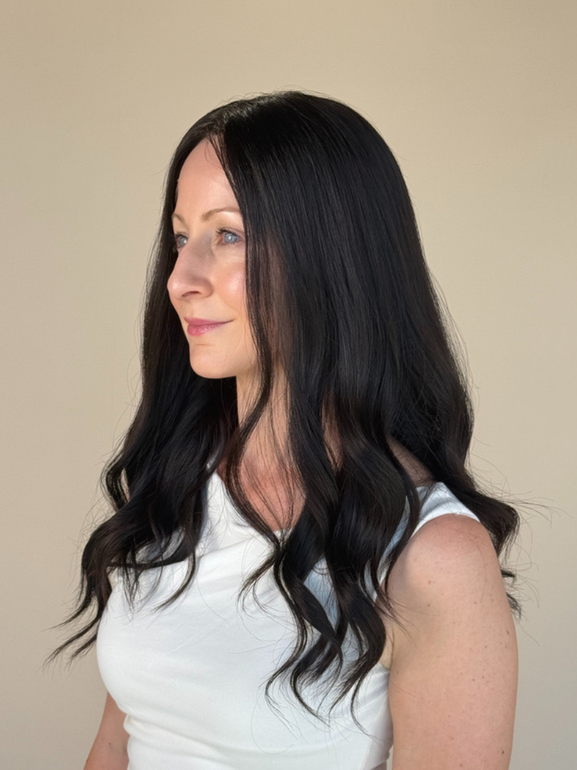 Onyx is a luscious virgin black which has never been coloured, showing off the hairs natural shimmer and shine. It looks so natural in this low density lob style. Colour: Natural Soft Black.