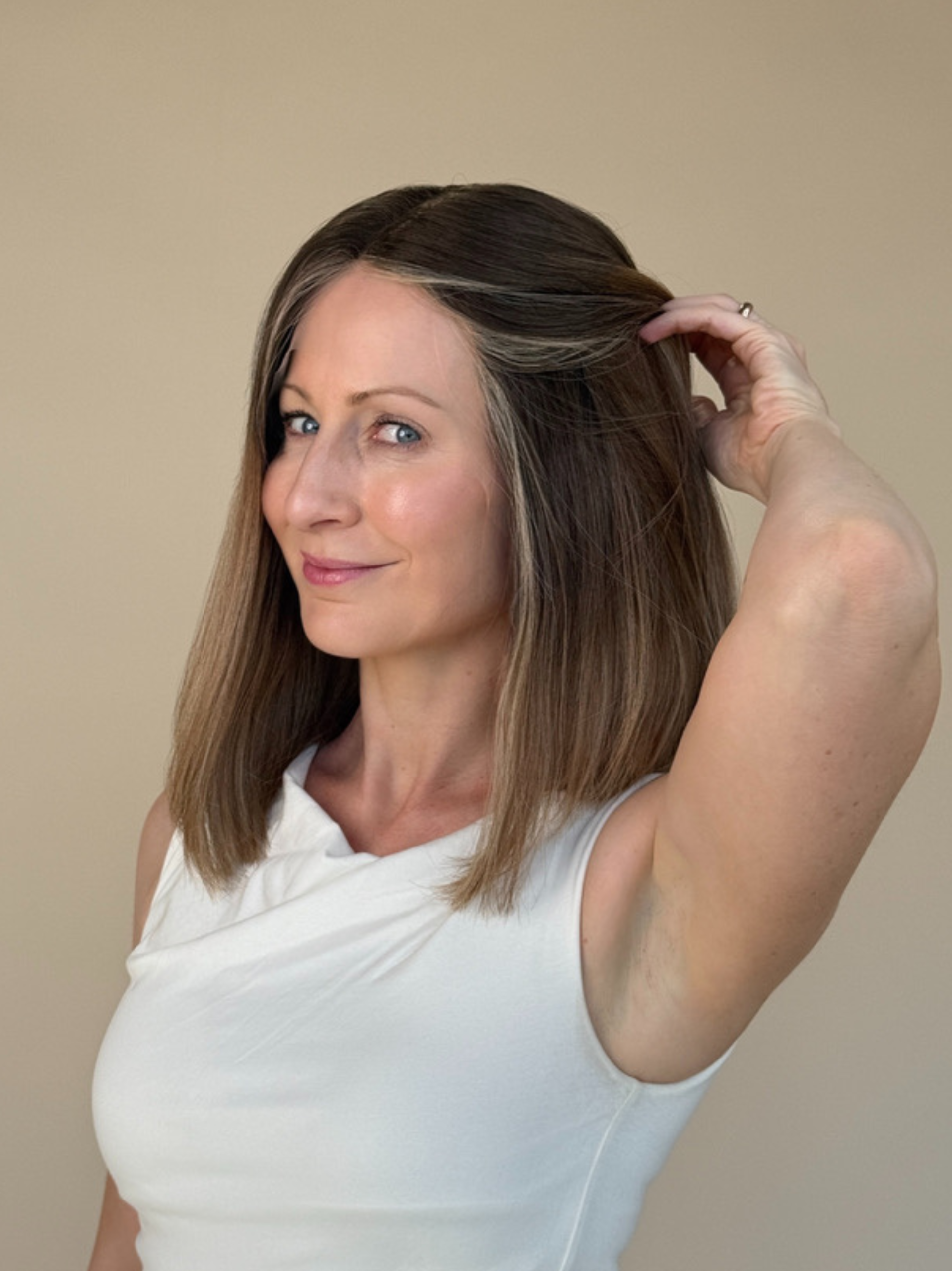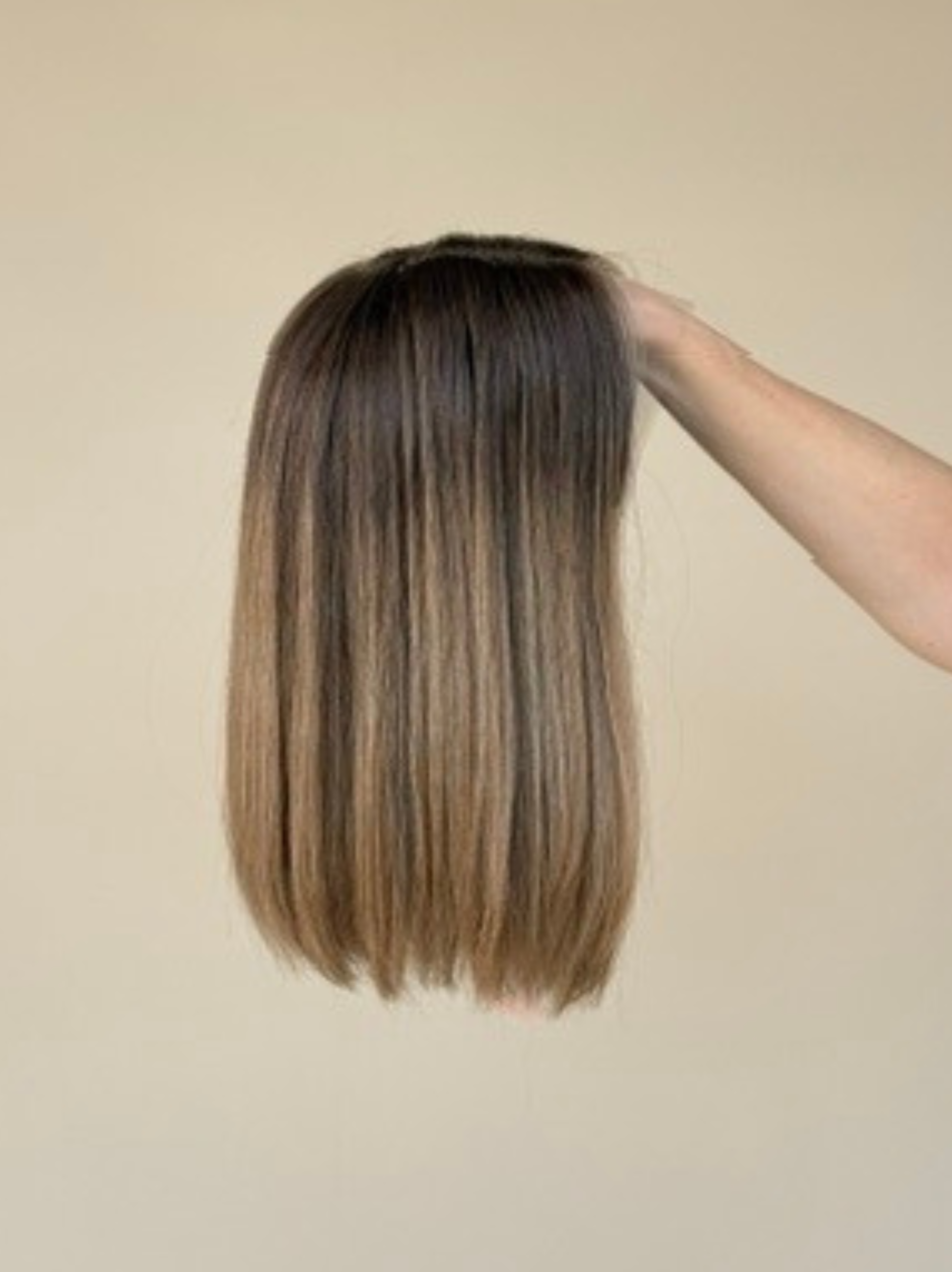 A softly dimensional brunette human hair wig featuring an ashy brown base with lighter blended ends. Lightweight and low-density for a natural, earthy tone with a smooth, modern finish