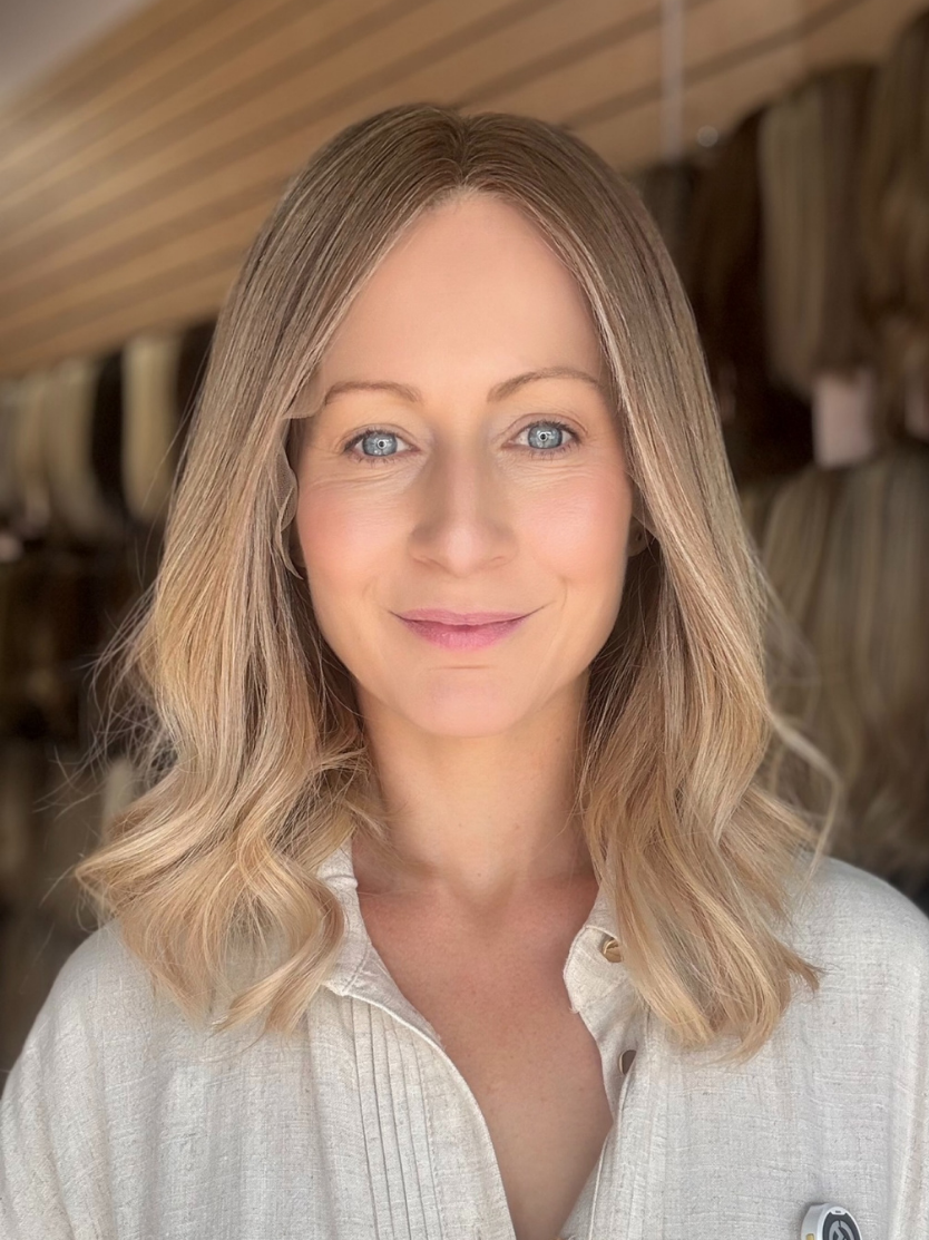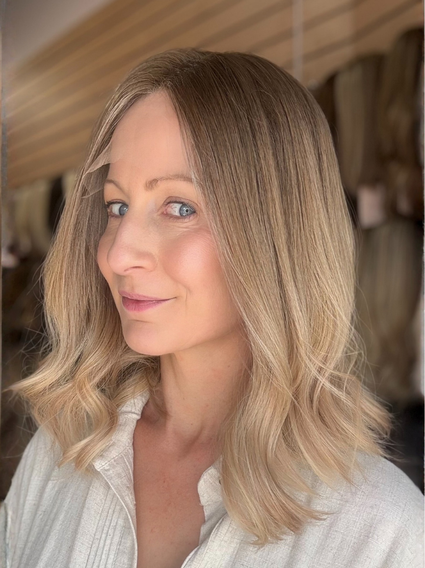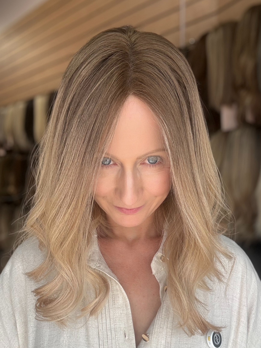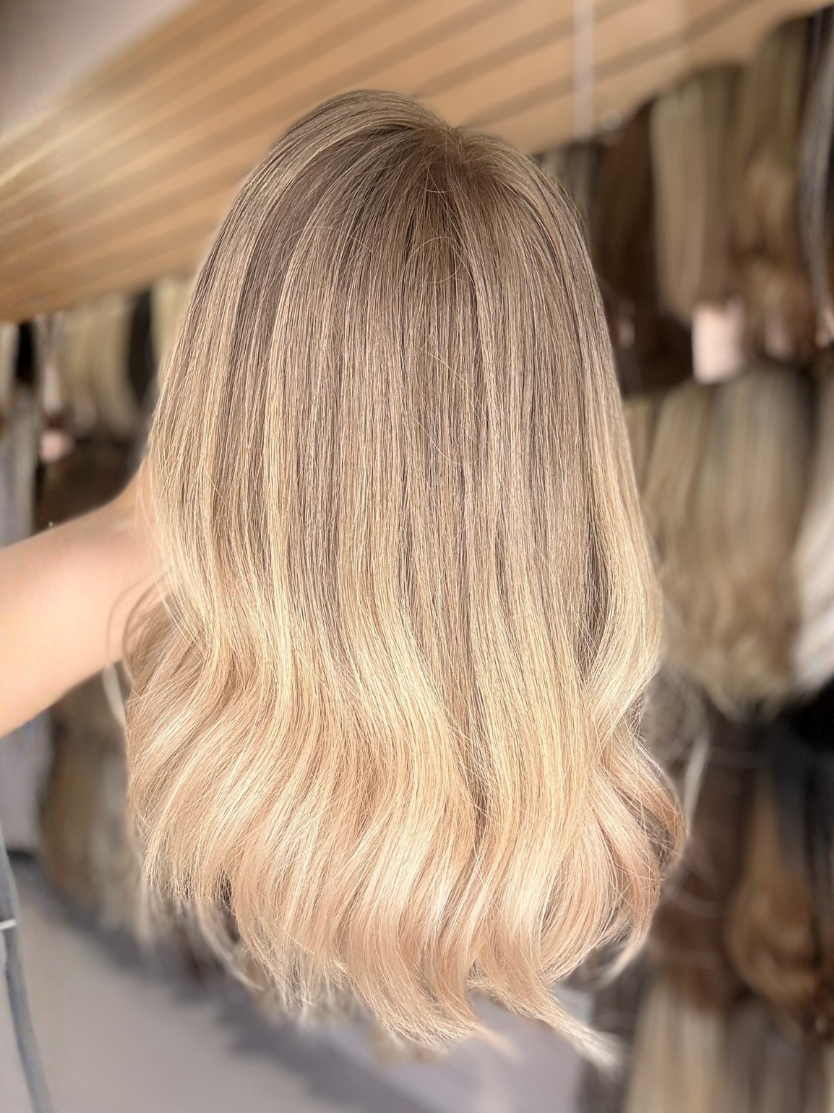 This colour features a soft, mousy dark blonde root that is stretched and seamlessly blended into beige, creamy light blonde ends. The gradual transition creates a natural, lived-in effect, mimicking a soft balayage. The beige and creamy tones add warmth and brightness. The result is a soft, effortless blonde with a beautifully blended, natural finish.