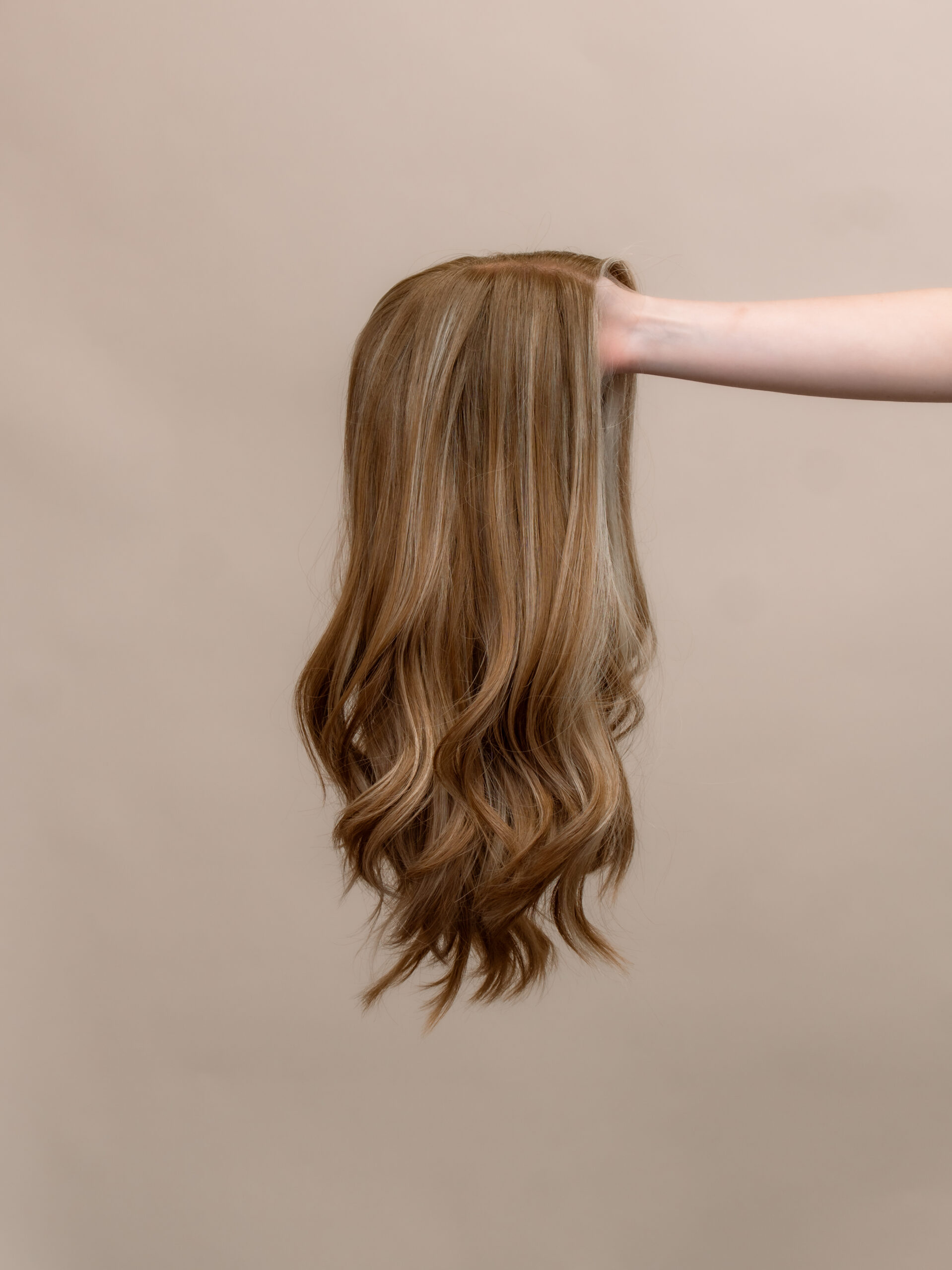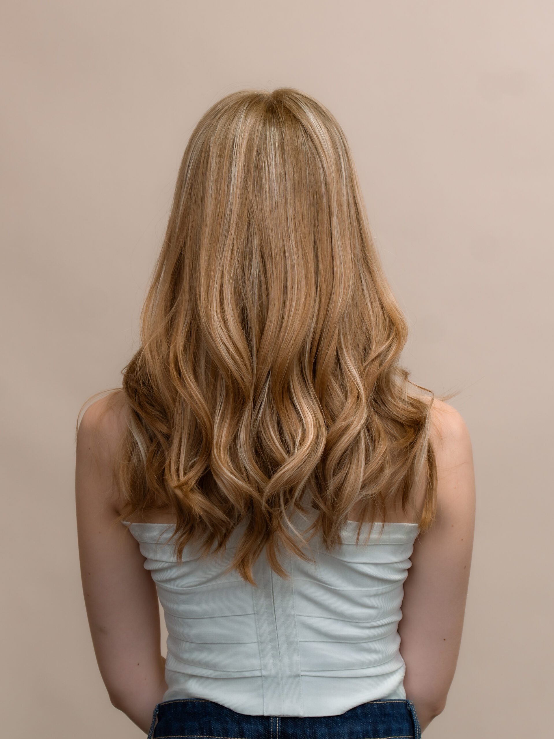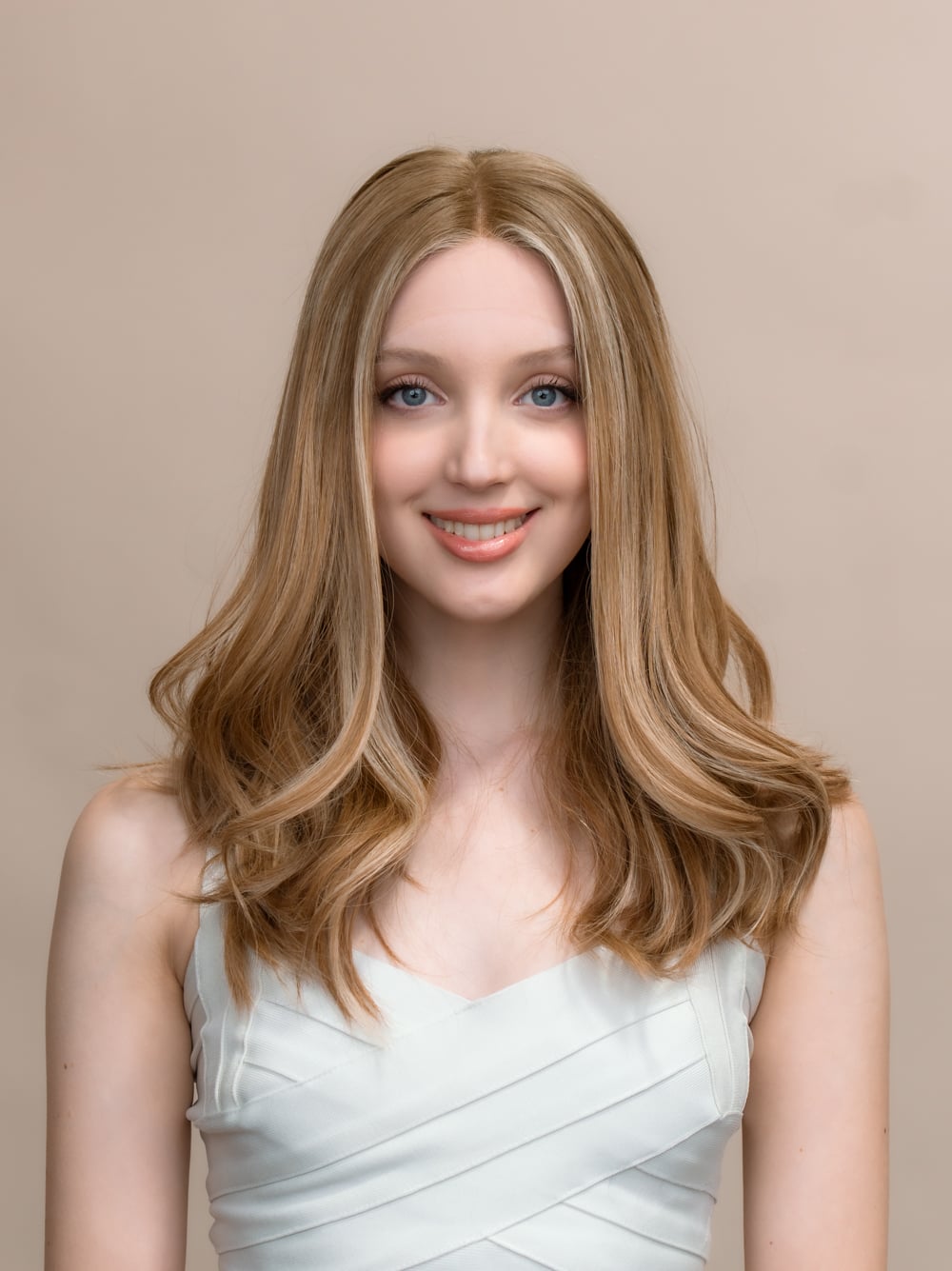 A rich golden dark blonde base with soft, sun-kissed highlights for warmth and radiant dimension. The medium-density lace top cap offers breathable comfort, a natural hairline, and flowing length with soft movement and glow.
