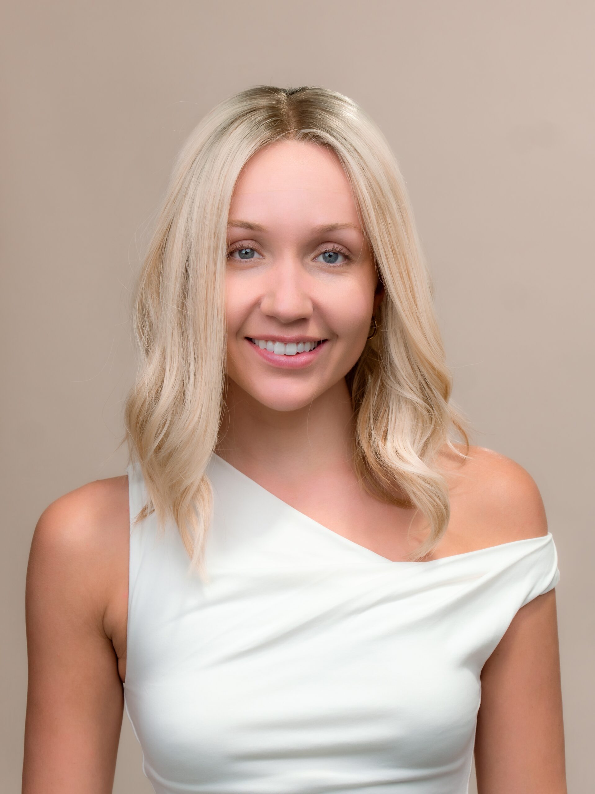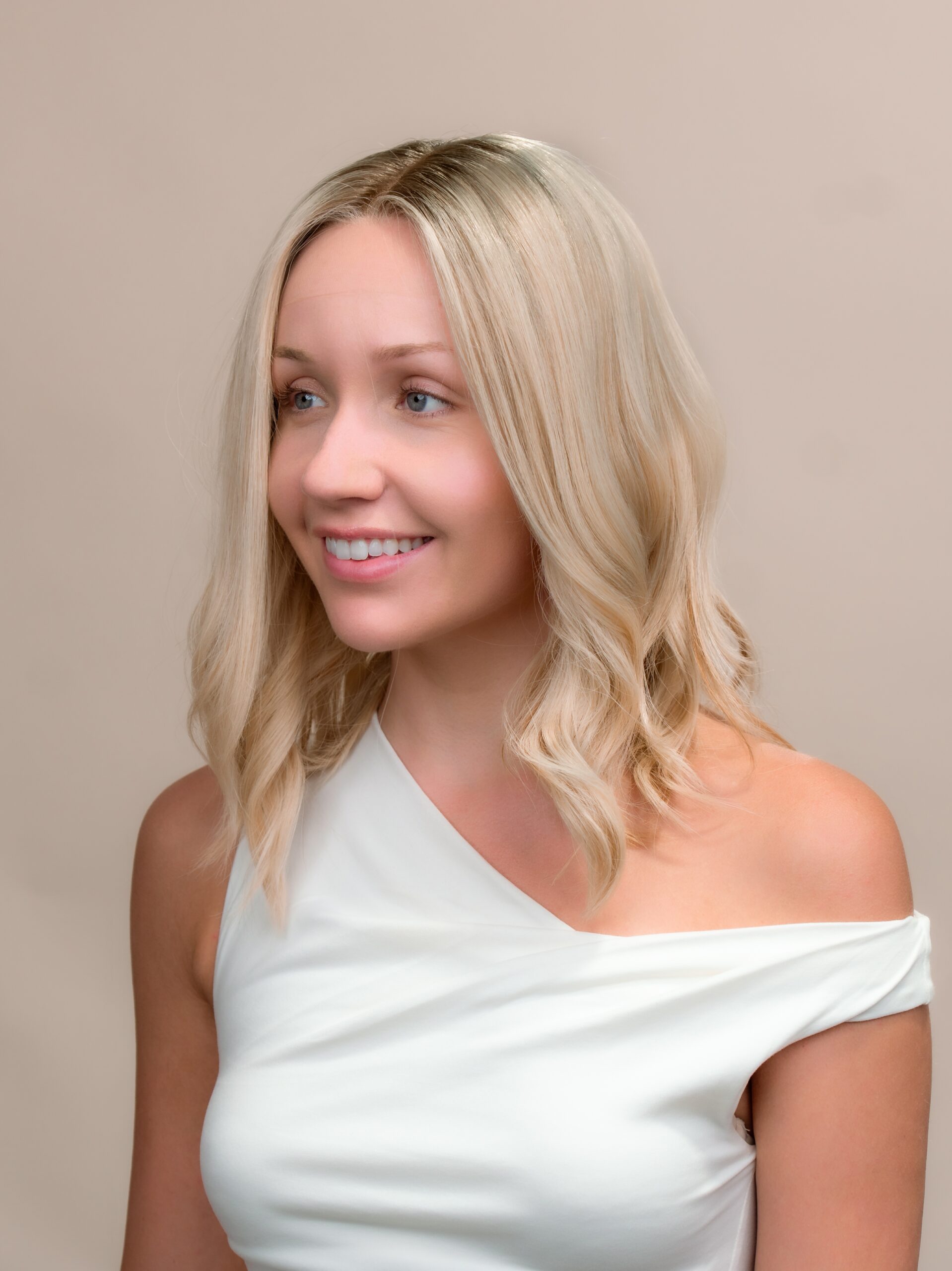 Warm blonde with a short dark root