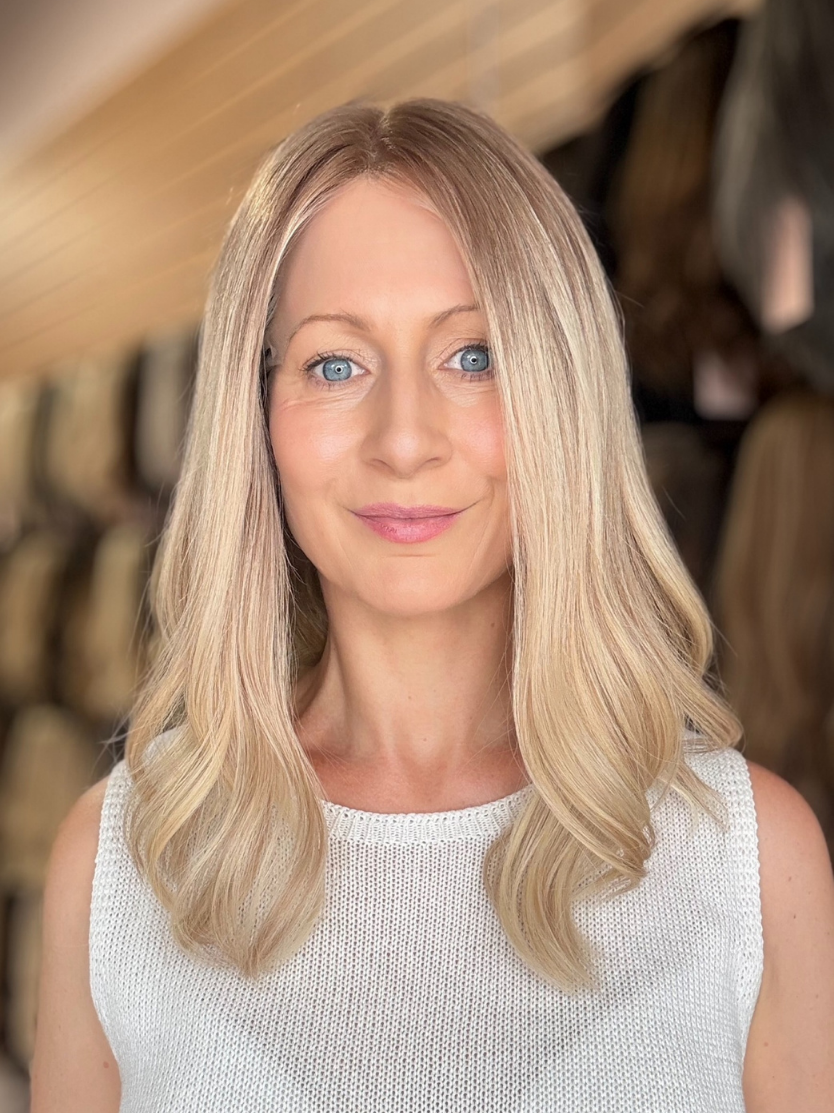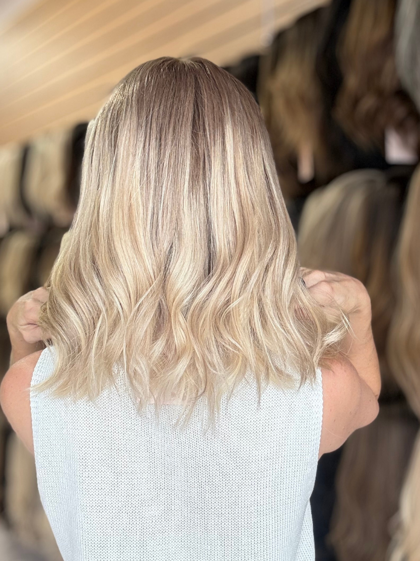 A soft, neutral dark blonde root melts seamlessly into a creamy, cool-toned blonde base. Subtle lowlights and naturally blended highs give this piece a lived-in, sun-kissed feel without appearing overly highlighted. The result is a chic, low-maintenance blonde that offers gentle contrast and depth — ideal for anyone seeking a fresh yet timeless look that feels effortlessly elevated.