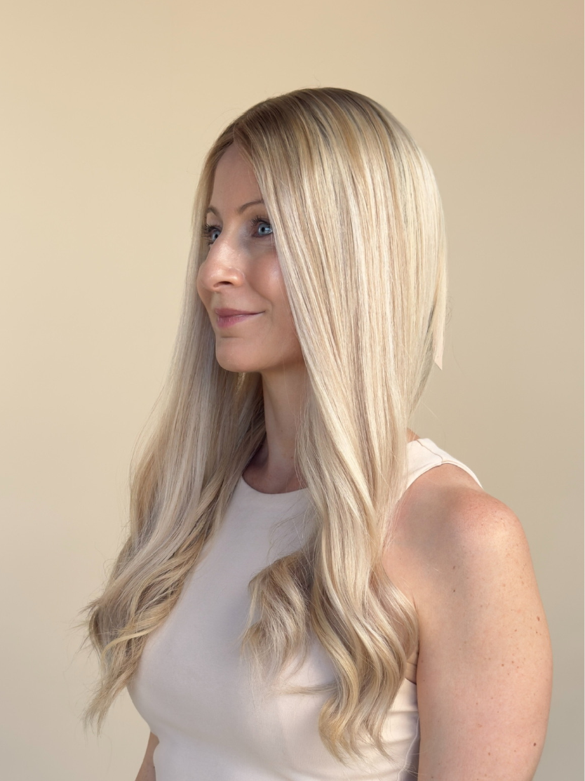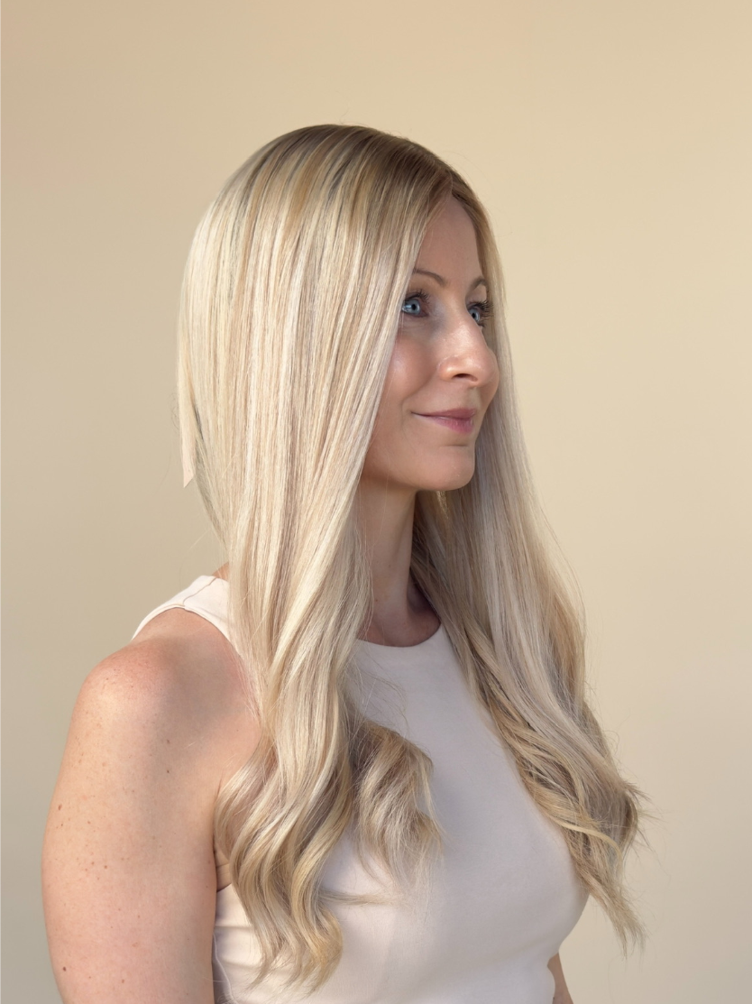 This shade is a soft, uniform creamy pale blonde, offering a bright, even-toned look without contrast or dimension. Perfect for those who love a clean, pure blonde with a soft, luminous effect.