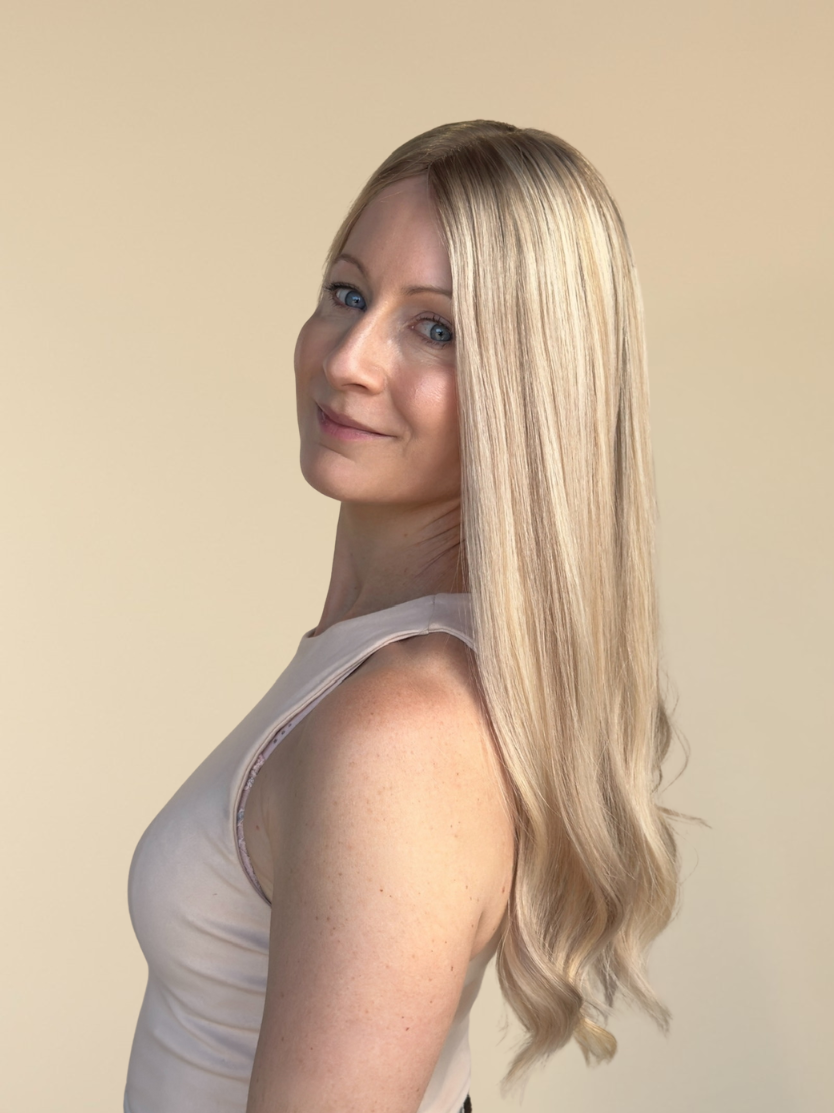 A topper is an extension that clips on to the top of your head adding volume and length. The silk top gives this topper it’s very natural part, the silk mimics a human scalp. The 100% hand tied silk is multi directional so you can comfortably part the hair anywhere on the top (Yes, you can do a side part!). The stretchy wefts at the back are light weight and breathable, they comfortably mould over your head helping the topper to sit very flat. and seamlessly blend with your own hair. The pressure sensitive clips ensure the topper is very secure, without pulling your own hair. A flat comb at the front to ensure the topper sits very flat and seamlessly blends with your own hair. Professionally cut and styled this beautiful topper is ready to wear straight out of the box! Medium density for natural coverage (130%) Length measured from crown to tip with slight layers Made from beautiful human hair, it will air dry straight and can be styled any way you like with hot tools.