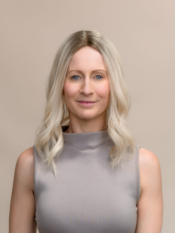 A pale golden blonde with soft lowlights and a natural dark root for subtle contrast and depth. This low-density lace topper offers lightweight volume with a natural, dimensional finish.