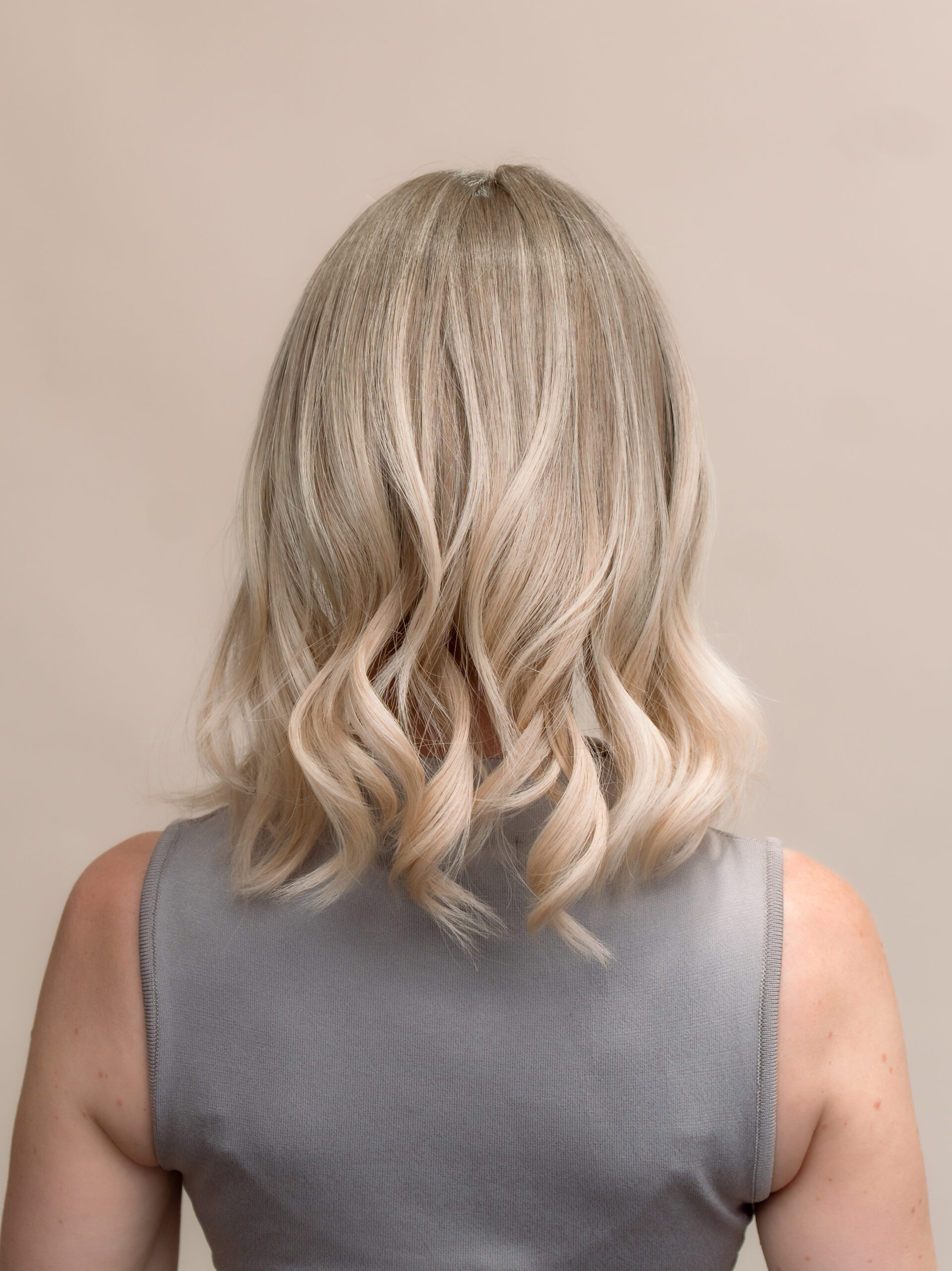A natural blend of cool-toned roots fading into creamy sandy blonde ends for a balanced, sun-kissed finish. The lace topper design sits flat, blends seamlessly, and offers lightweight, natural coverage. Made from premium human hair, it air dries straight and can be styled with hot tools — soft, radiant, and beautifully natural.
