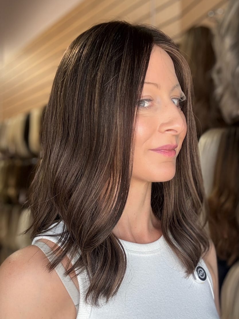 A deep cool brunette base is elevated with fine, blended blonde highlights that add soft contrast and dimension, making it ideal for those who prefer a brunette that’s natural but still brightened around the face and throughout the ends.