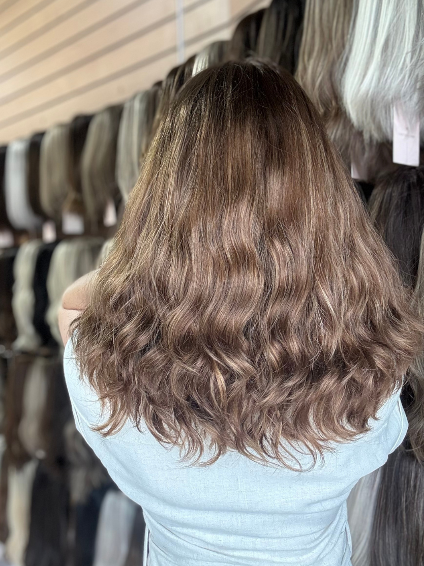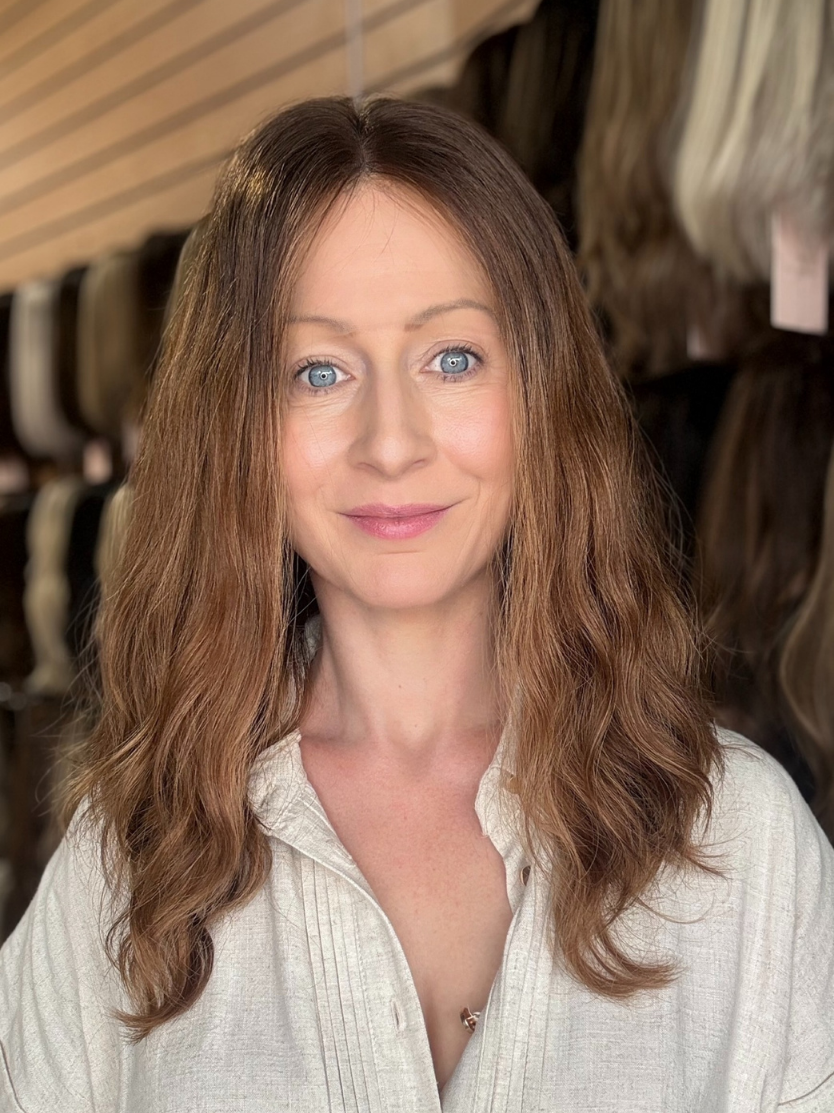 A rich, warm-toned brunette infused with cinnamon hues, this shade has a soft, spicy warmth that enhances depth. Delicate golden highlights are finely woven throughout, adding brightness and a subtle sun-kissed effect. The result is a dimensional, warm brunette with natural movement and a rich, inviting glow.