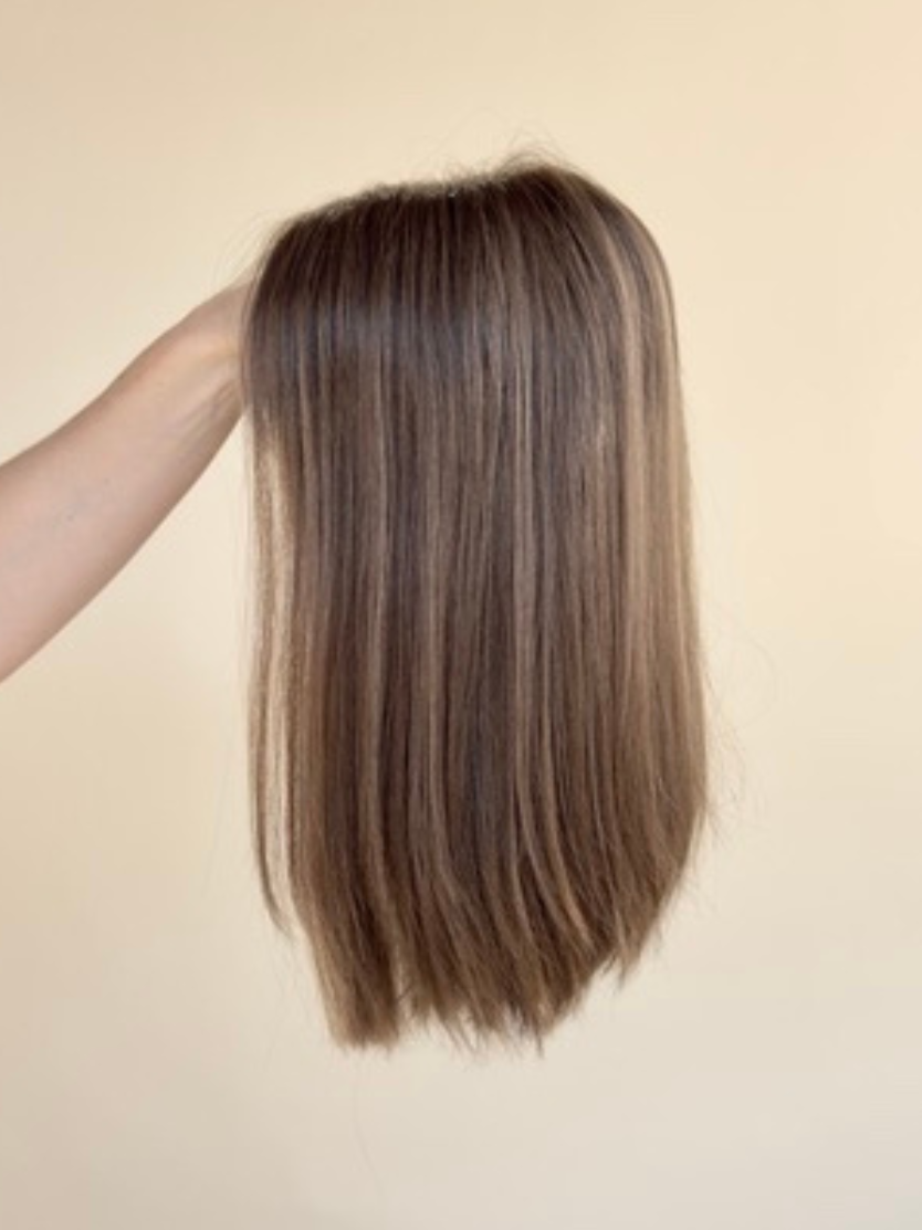 A neutral light brown base is softly brightened with barely-there blonde accents, creating a smooth and natural bronde. The dimension is delicate and blended, making this an ideal choice for those wanting a refined, polished look that feels both timeless and modern.