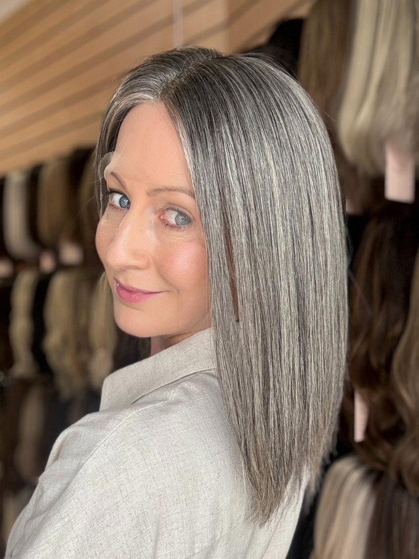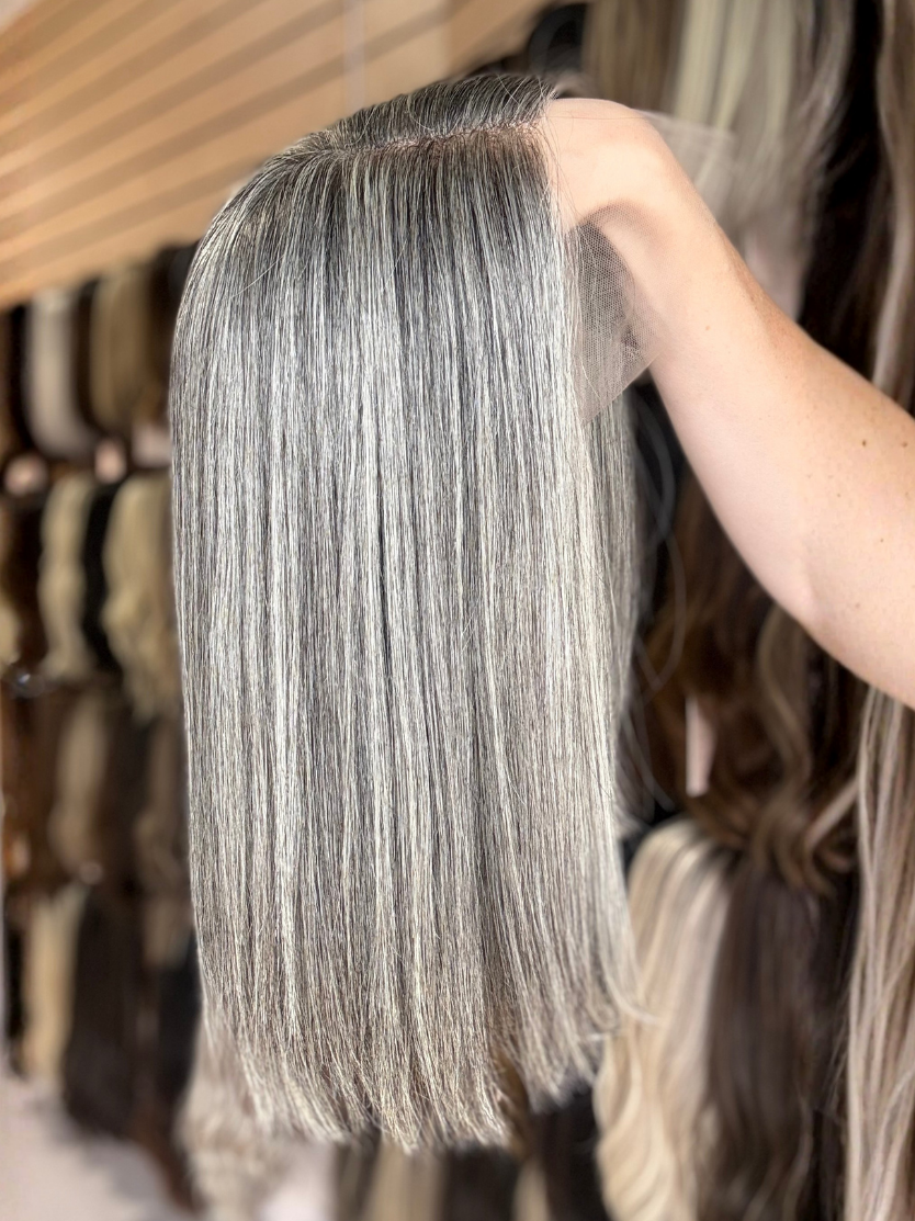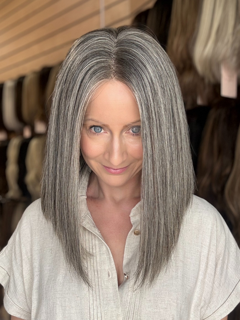 This shade is a classic, natural grey with a balanced blend of cool steel tones. With more salt (lighter grey) than pepper (deeper strands), it creates a soft, diffused look that mimics naturally greying hair. The cool undertones give it a refined, modern feel, while the true salt-and-pepper mix adds depth and dimension, resulting in an effortlessly authentic, sophisticated grey.