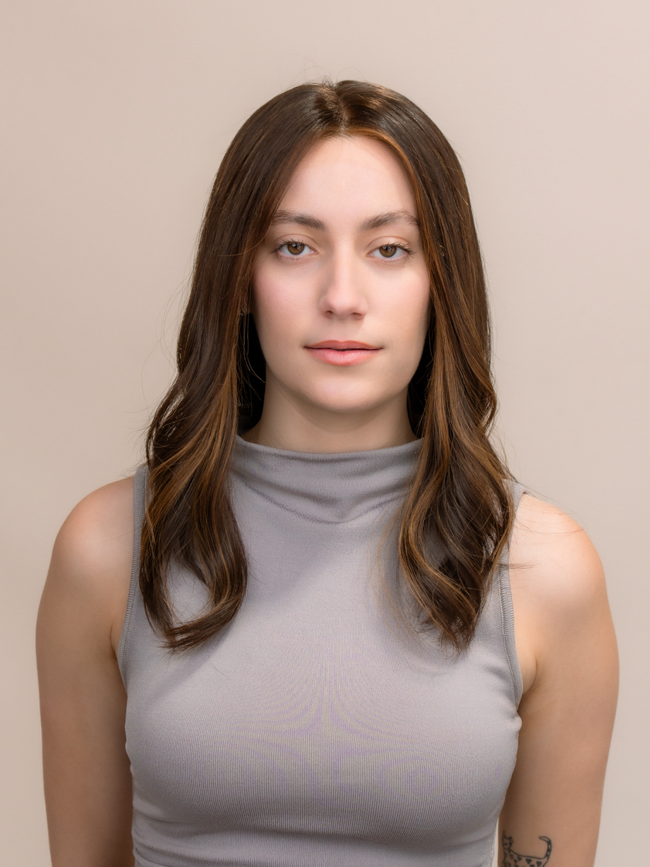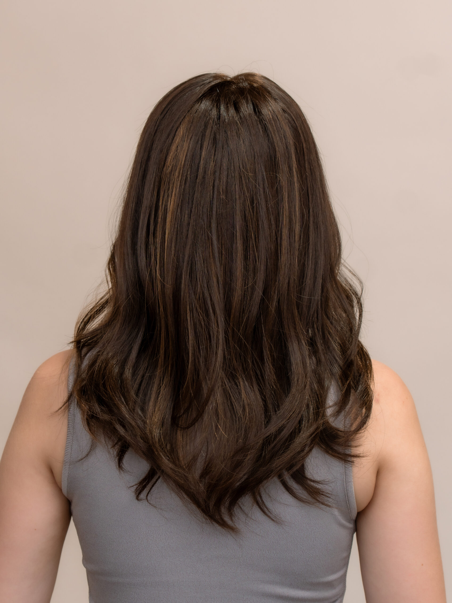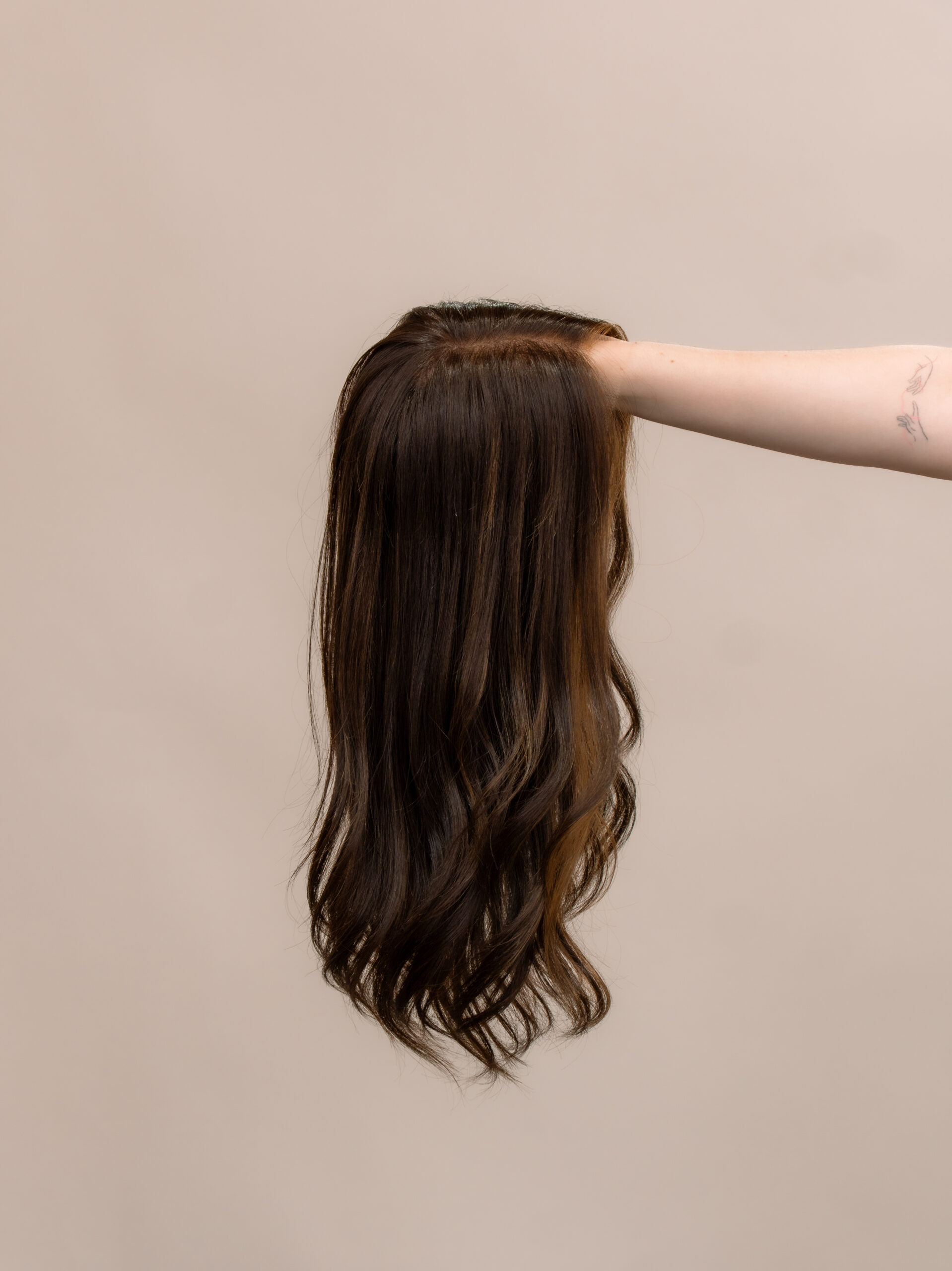 A radiant brunette human hair wig with soft golden tones for natural warmth and depth. Fully hand tied, lightweight, and breathable for a seamless, glowing, and sophisticated finish.