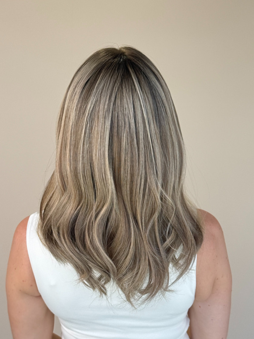 This balanced bronde shade sits between blonde and brunette, offering depth and brightness in perfect harmony. A matte root creates a soft, natural grow-out effect, while subtle peach undertones add warmth and a hint of radiance without overpowering the tone. The defined blonde highlights enhance contrast and dimension, giving the colour a sun-kissed, multi-dimensional look with a modern, sophisticated finish. Perfect for those who want a rich, effortless blend of blonde and brunette with a touch of warmth.
