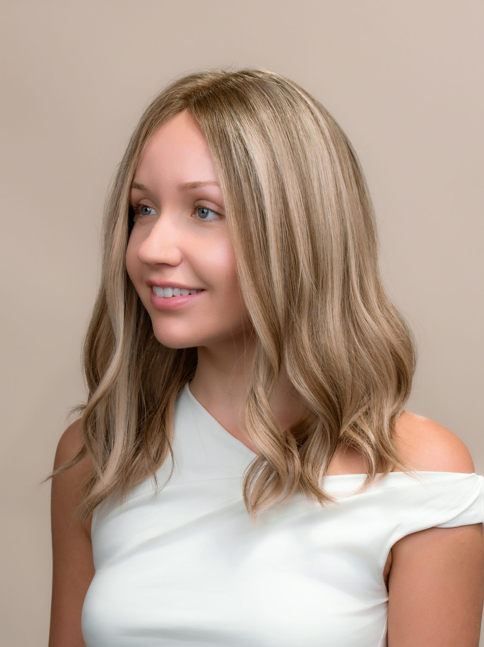 A modern bronde shade blending soft blonde and brunette tones with peach undertones and defined highlights. This fully hand tied wig features a breathable cap, medium density, and graceful length — offering natural movement and a beautifully radiant finish.