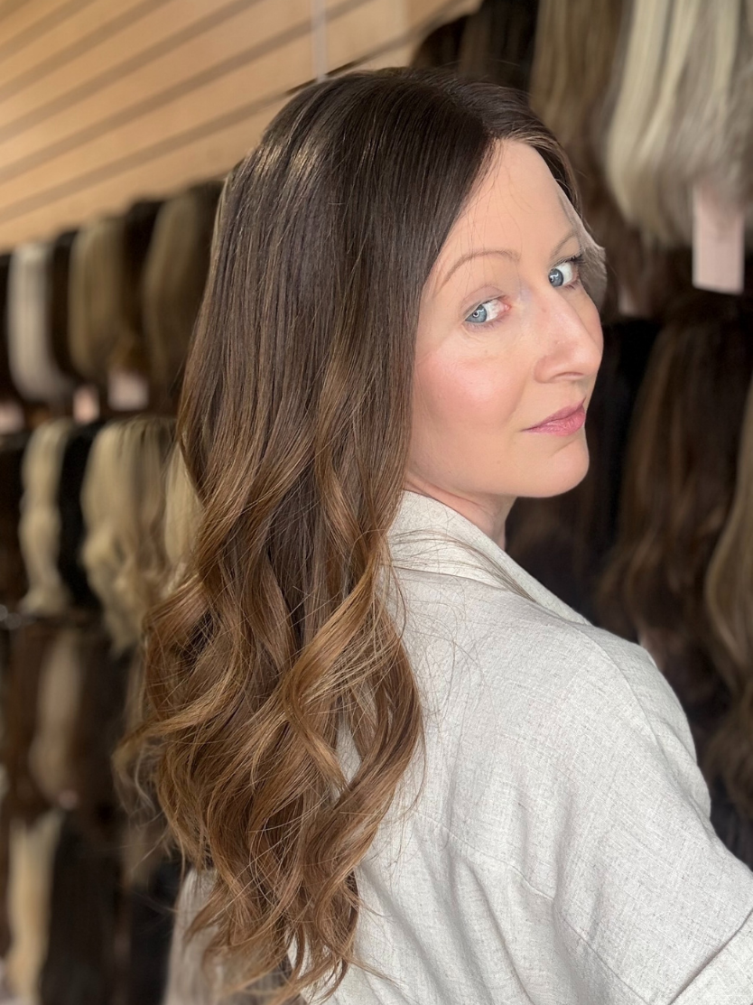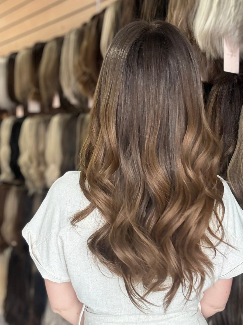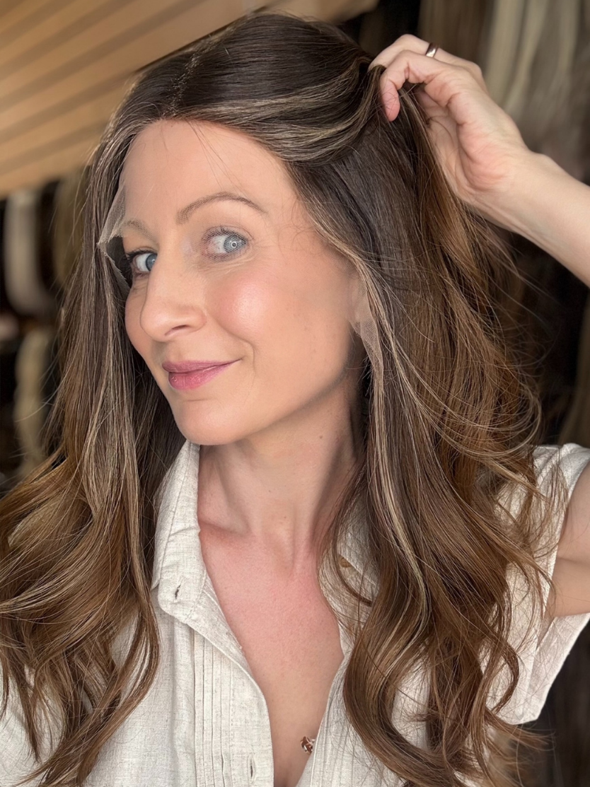 A rich brunette human hair wig featuring softly blended caramel tones for natural warmth and brightness. Lightweight, breathable, and beautifully dimensional for an effortless, sun-kissed look.