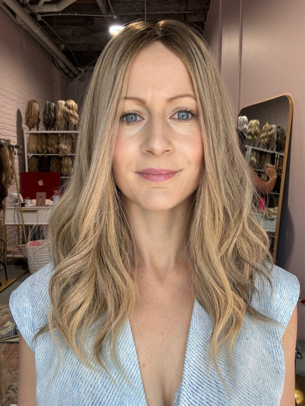 The perfect blend between a lace wig and a topper, this large base Lace Topper is the best of both worlds. Flattering baby blonde with a very subtle root.