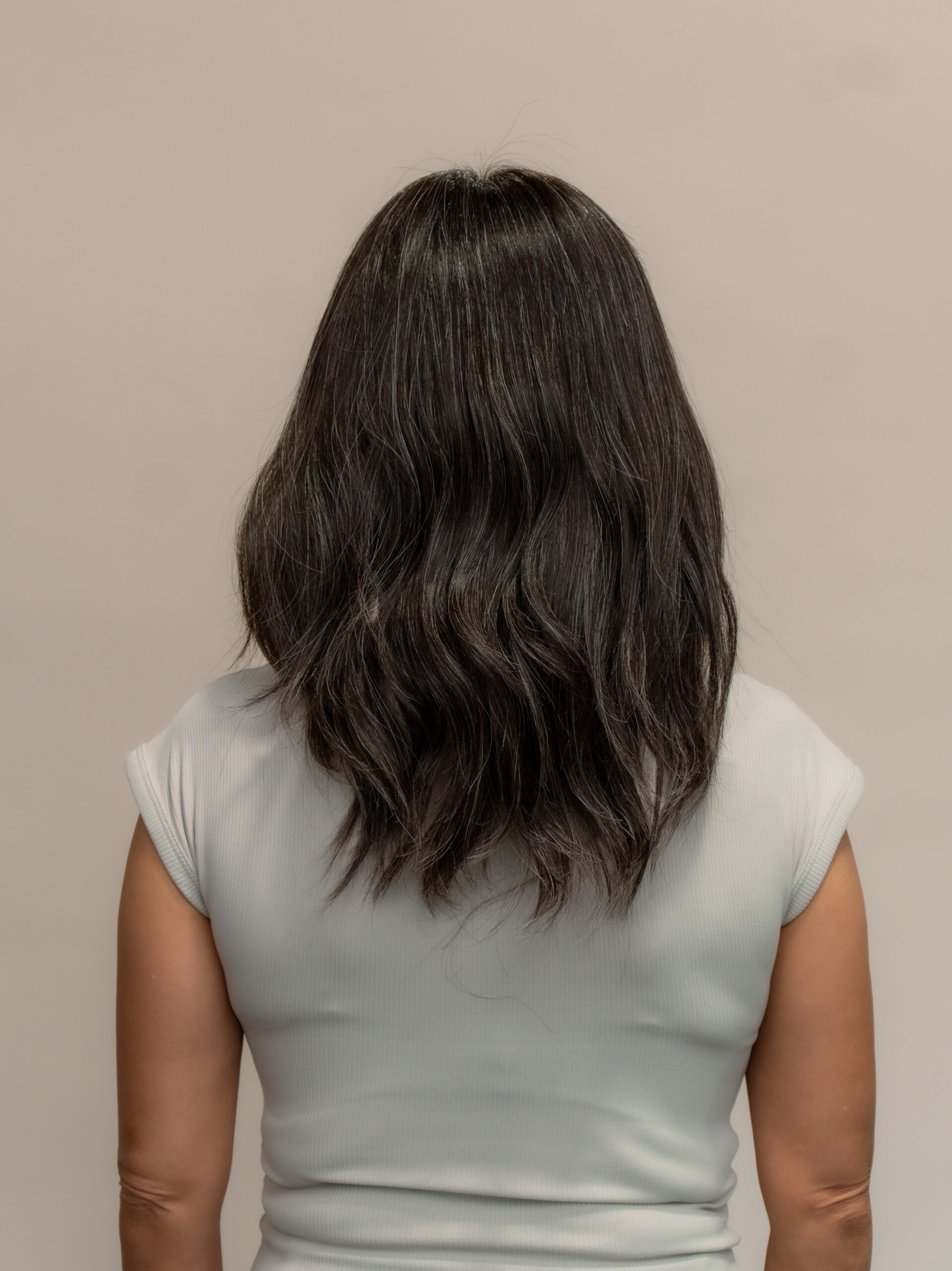 A topper is an extension that clips on to the top of your head adding volume and length. The exact same cap style as our classic silk toppers, except the silk area is a lightweight lace material. This topper is easier for people with less hair at the hairline to blend as it sit very flat. The 100% hand tied lace is multi directional so you can comfortably part the hair anywhere on the top (Yes, you can do a side part!). The stretchy wefts at the back are light weight and breathable, they comfortably mould over your head helping the topper to sit very flat. and seamlessly blend with your own hair. The pressure sensitive clips ensure the topper is very secure, without pulling your own hair. 2 flat combs at the front to ensure the topper sits very flat and seamlessly blends with your own hair. Professionally cut and styled this beautiful topper is ready to wear straight out of the box! Low density for natural coverage (110%). Length measured from crown to tip with slight layers. Made from beautiful human hair, it will air dry straight and can be styled any way you like with hot tools.