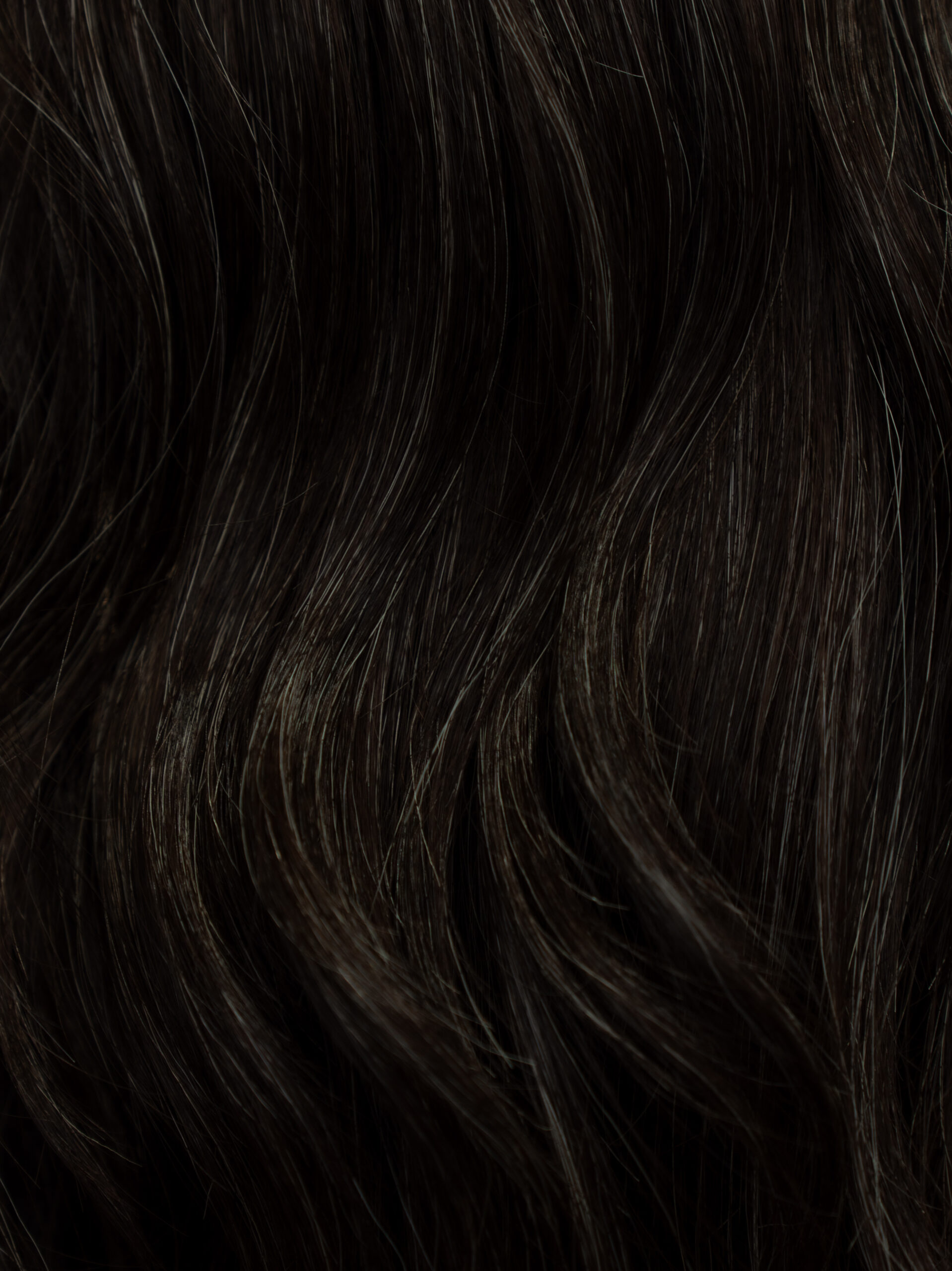 A deep espresso brown base with cool charcoal tones, softened by natural silver streaks through the front and crown.