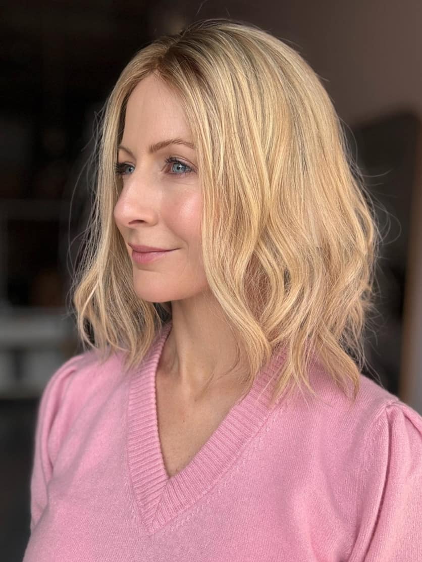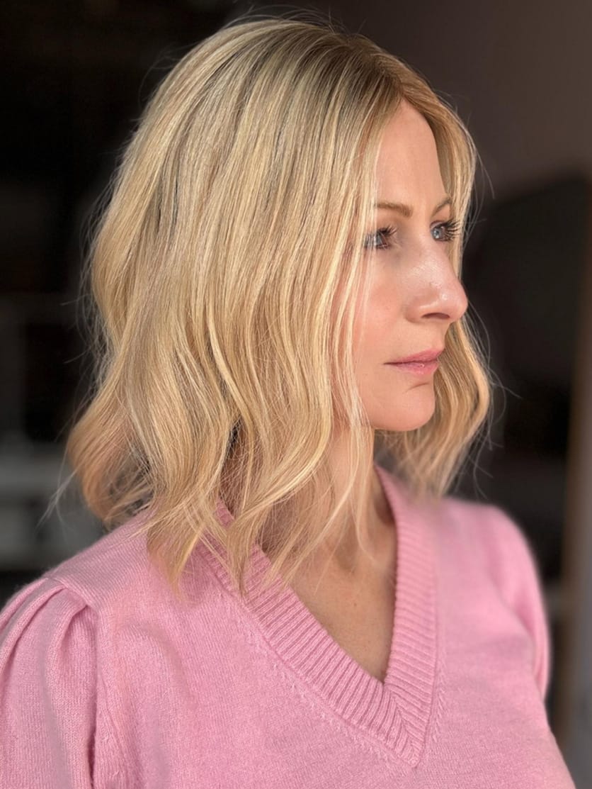 This shade features a soft, warm baby blonde base with delicate golden undertones, creating a bright and youthful look. The very subtle root adds a natural blend, enhancing depth while maintaining an overall light and luminous appearance. This colour is perfect for those who love a soft, sun-kissed blonde with a seamless, effortless finish.