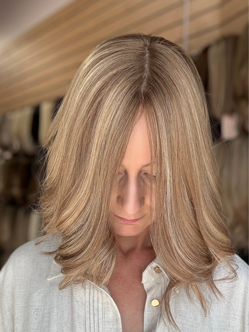 A topper is an extension that clips on to the top of your head adding volume and length. The silk top gives this topper it’s very natural part, the silk mimics a human scalp. The 100% hand tied silk is multi directional so you can comfortably part the hair anywhere on the top (Yes, you can do a side part!). The stretchy wefts at the back are light weight and breathable, they comfortably mould over your head helping the topper to sit very flat. and seamlessly blend with your own hair. The pressure sensitive clips ensure the topper is very secure, without pulling your own hair. A flat comb at the front to ensure the topper sits very flat and seamlessly blends with your own hair. Professionally cut and styled this beautiful topper is ready to wear straight out of the box! Medium density for natural coverage (130%) Length measured from crown to tip with slight layers Made from beautiful human hair, it will air dry straight and can be styled any way you like with hot tools.If you decide that your piece will not work for you, Goldylost Hair accepts returns on all stock wigs and hair toppers purchased online, this includes pre-orders. Read the full Returns Policy.