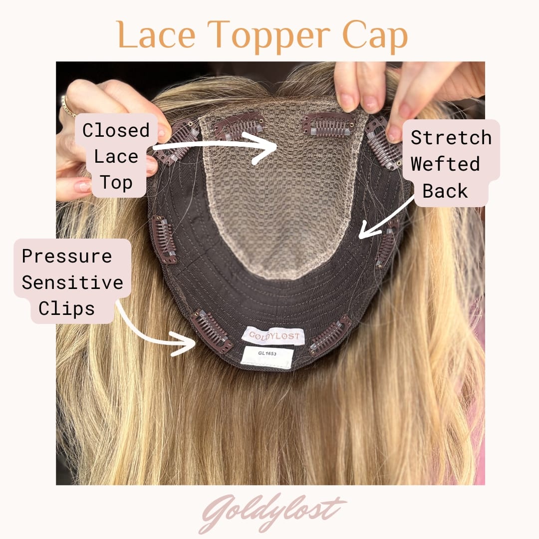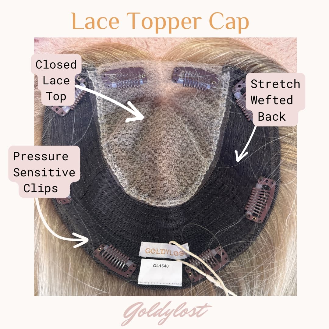 A topper is an extension that clips on to the top of your head adding volume and length. The exact same cap style as our classic silk toppers, except the silk area is a lightweight lace material. This topper is easier for people with less hair at the hairline to blend as it sit very flat. The 100% hand tied lace is multi directional so you can comfortably part the hair anywhere on the top (Yes, you can do a side part!). The stretchy wefts at the back are light weight and breathable, they comfortably mould over your head helping the topper to sit very flat. and seamlessly blend with your own hair. The pressure sensitive clips ensure the topper is very secure, without pulling your own hair. 2 flat combs at the front to ensure the topper sits very flat and seamlessly blends with your own hair. Professionally cut and styled this beautiful topper is ready to wear straight out of the box! Low density for natural coverage (110%). Length measured from crown to tip with slight layers. Made from beautiful human hair, it will air dry straight and can be styled any way you like with hot tools.If you decide that your piece will not work for you, Goldylost Hair accepts returns on all stock wigs and hair toppers purchased online, this includes pre-orders. Read the full Returns Policy.