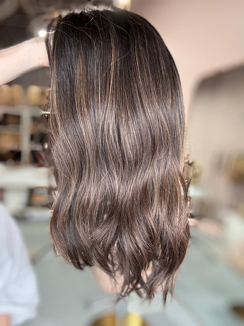This shade features a deep, warm golden brown base enhanced with delicate, finely woven golden highlights for a radiant, sun-kissed effect. The golden tones add warmth, richness, and dimension, creating a luminous, multi-dimensional brunette that looks vibrant and effortlessly natural. Perfect for those who want a warm, glowing brown with soft, seamless highlights that enhance movement and shine.