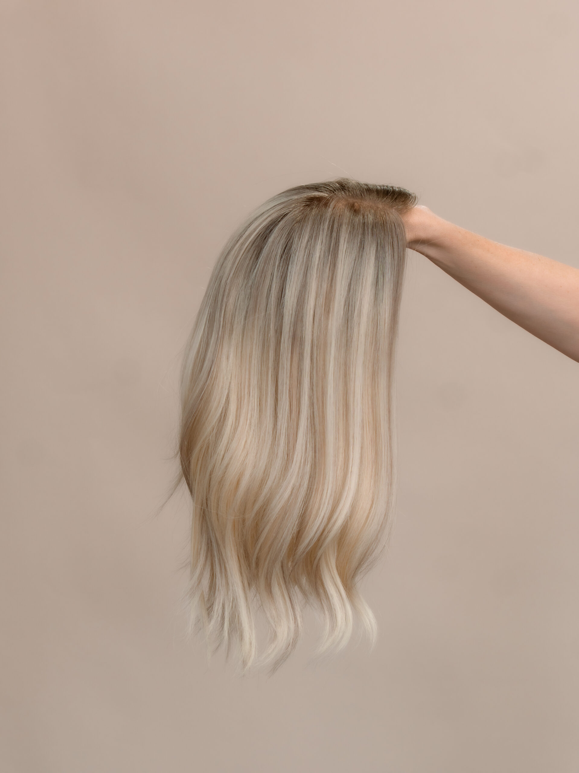 A luminous very light blonde shade with soft lowlights and a subtle root for added depth and a sun-kissed finish. Designed for those with less hair at the hairline, this low-density lace topper sits very flat, offering natural volume and lightweight comfort.