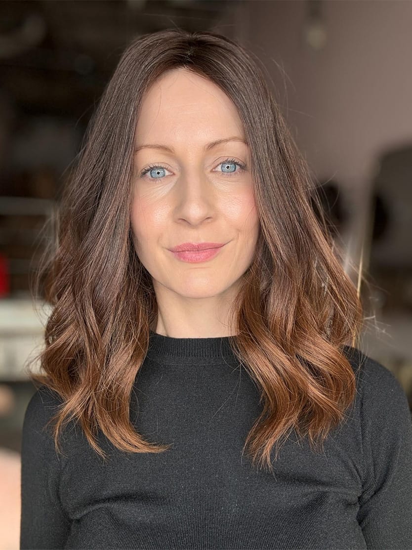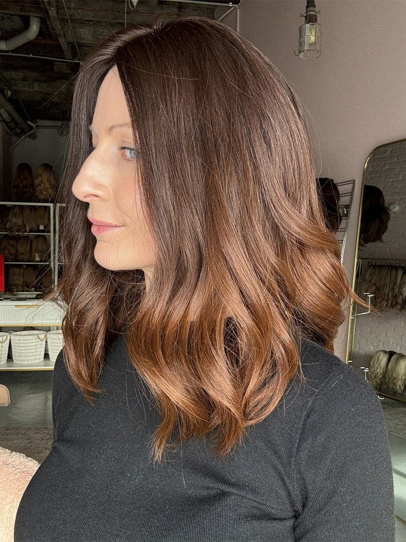 This shade features a rich, chocolate brunette base, offering depth and warmth, seamlessly blending into slightly lighter copper-toned ends. The subtle copper hues add a soft, radiant glow, enhancing movement and dimension without overpowering the deep brunette base. The result is a natural, sunlit effect, perfect for those who want a warm, multi-dimensional brunette with a hint of copper for added vibrancy and richness.