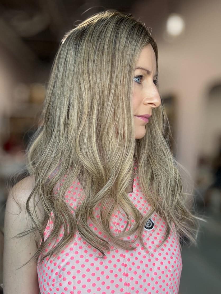This stunning bronde shade features a rich mocha-toned root and lowlights, adding depth and contrast, while light blonde highlights enhance brightness and dimension. The blend of warm and cool tones creates a high-definition, multi-dimensional effect, making the colour appear natural yet striking. The result is a sophisticated, well-balanced bronde with seamless transitions and enhanced movement. Perfect for those who want a low-maintenance yet high-impact look.