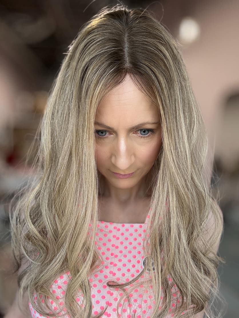 A topper is an extension that clips on to the top of your head adding volume and length. The exact same cap style as our classic silk toppers, except the silk area is a lightweight lace material. This topper is easier for people with less hair at the hairline to blend as it sit very flat. The 100% hand tied lace is multi directional so you can comfortably part the hair anywhere on the top (Yes, you can do a side part!). The stretchy wefts at the back are light weight and breathable, they comfortably mould over your head helping the topper to sit very flat. and seamlessly blend with your own hair. The pressure sensitive clips ensure the topper is very secure, without pulling your own hair. 2 flat combs at the front to ensure the topper sits very flat and seamlessly blends with your own hair. Professionally cut and styled this beautiful topper is ready to wear straight out of the box! Low density for natural coverage (110%). Length measured from crown to tip with slight layers. Made from beautiful human hair, it will air dry straight and can be styled any way you like with hot tools.If you decide that your piece will not work for you, Goldylost Hair accepts returns on all stock wigs and hair toppers purchased online, this includes pre-orders. Read the full Returns Policy.