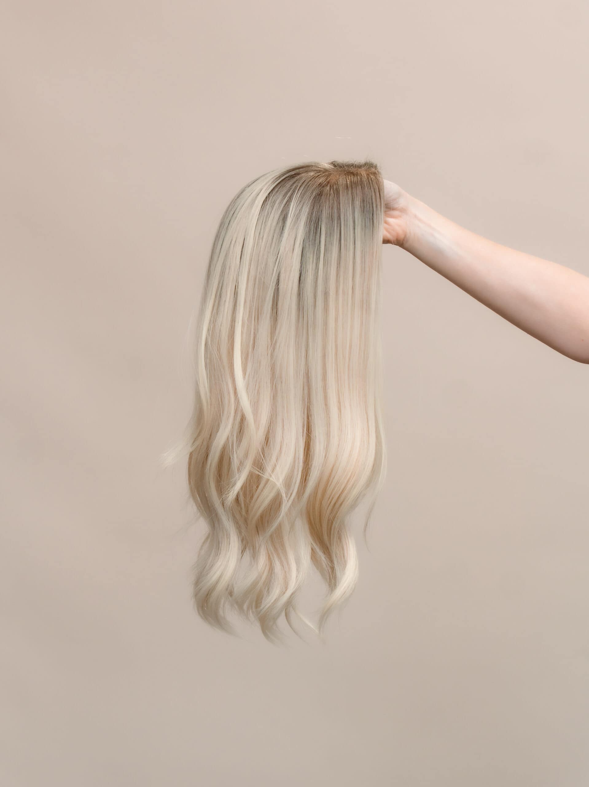 A topper is an extension that clips on to the top of your head adding volume and length. The exact same cap style as our classic silk toppers, except the silk area is a lightweight lace material. This topper is easier for people with less hair at the hairline to blend as it sit very flat. The 100% hand tied lace is multi directional so you can comfortably part the hair anywhere on the top (Yes, you can do a side part!). The stretchy wefts at the back are light weight and breathable, they comfortably mould over your head helping the topper to sit very flat. and seamlessly blend with your own hair. The pressure sensitive clips ensure the topper is very secure, without pulling your own hair. 2 flat combs at the front to ensure the topper sits very flat and seamlessly blends with your own hair. Professionally cut and styled this beautiful topper is ready to wear straight out of the box! Low density for natural coverage (110%). Length measured from crown to tip with slight layers. Made from beautiful human hair, it will air dry straight and can be styled any way you like with hot tools.If you decide that your piece will not work for you, Goldylost Hair accepts returns on all stock wigs and hair toppers purchased online, this includes pre-orders. Read the full Returns Policy.