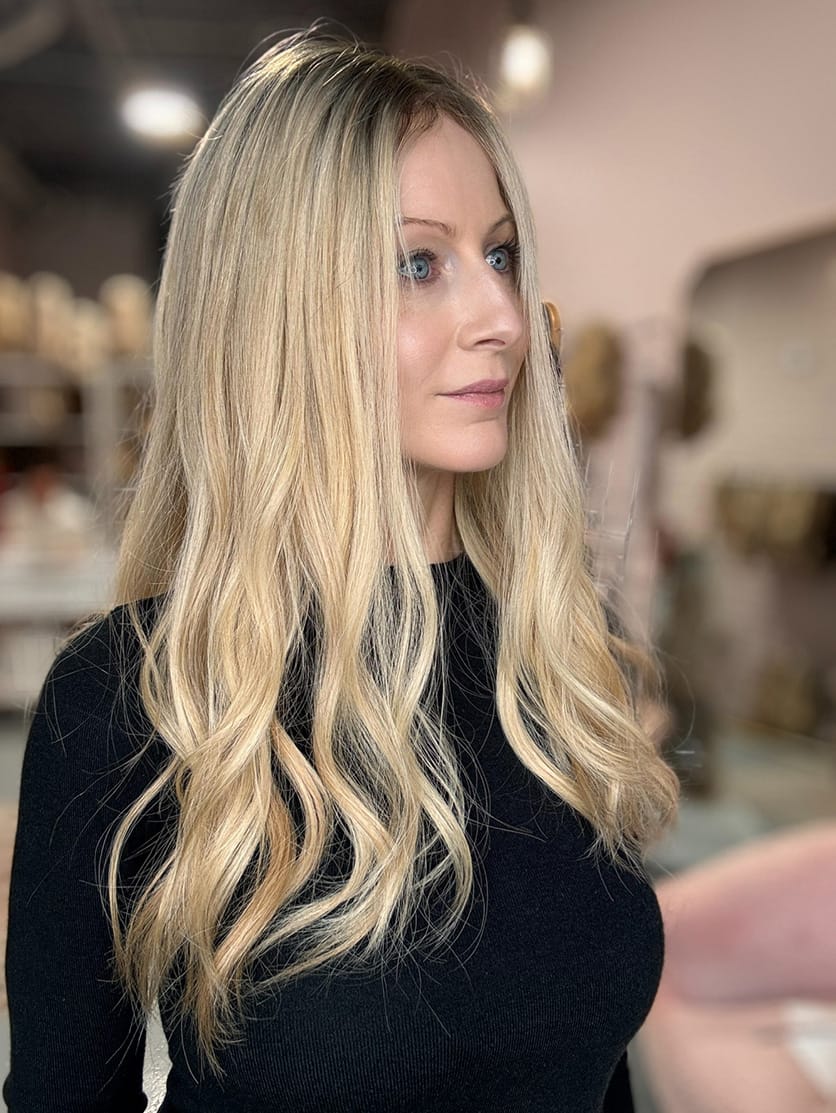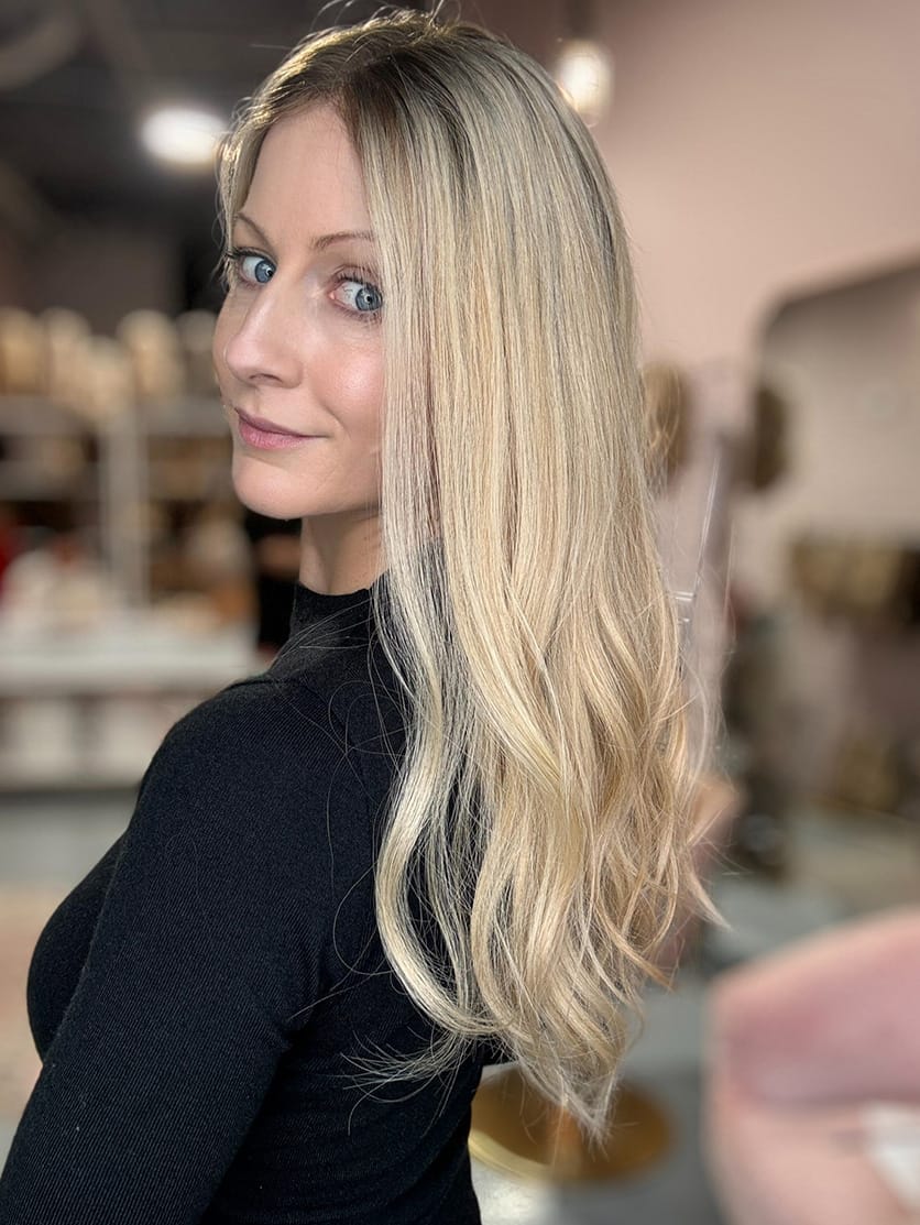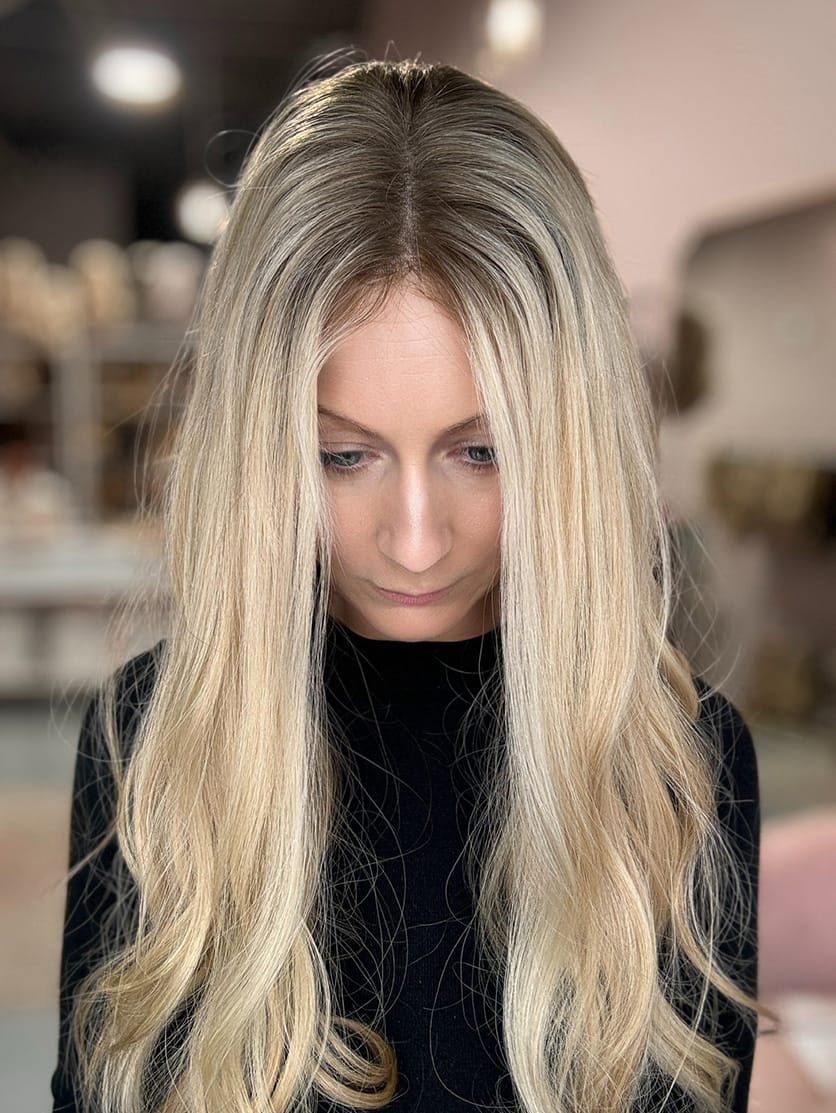A pale golden-toned blonde shade that blends seamlessly into a deeper, natural-looking root. The golden blonde lowlights add subtle dimension, while the darker root creates contrast for a lived-in, low-maintenance look. This colour technique mimics natural hair growth, adding depth and dimension while making it easy to blend with your own hiar. It’s perfect for those who want a sun-kissed, effortless style with a touch of warmth.