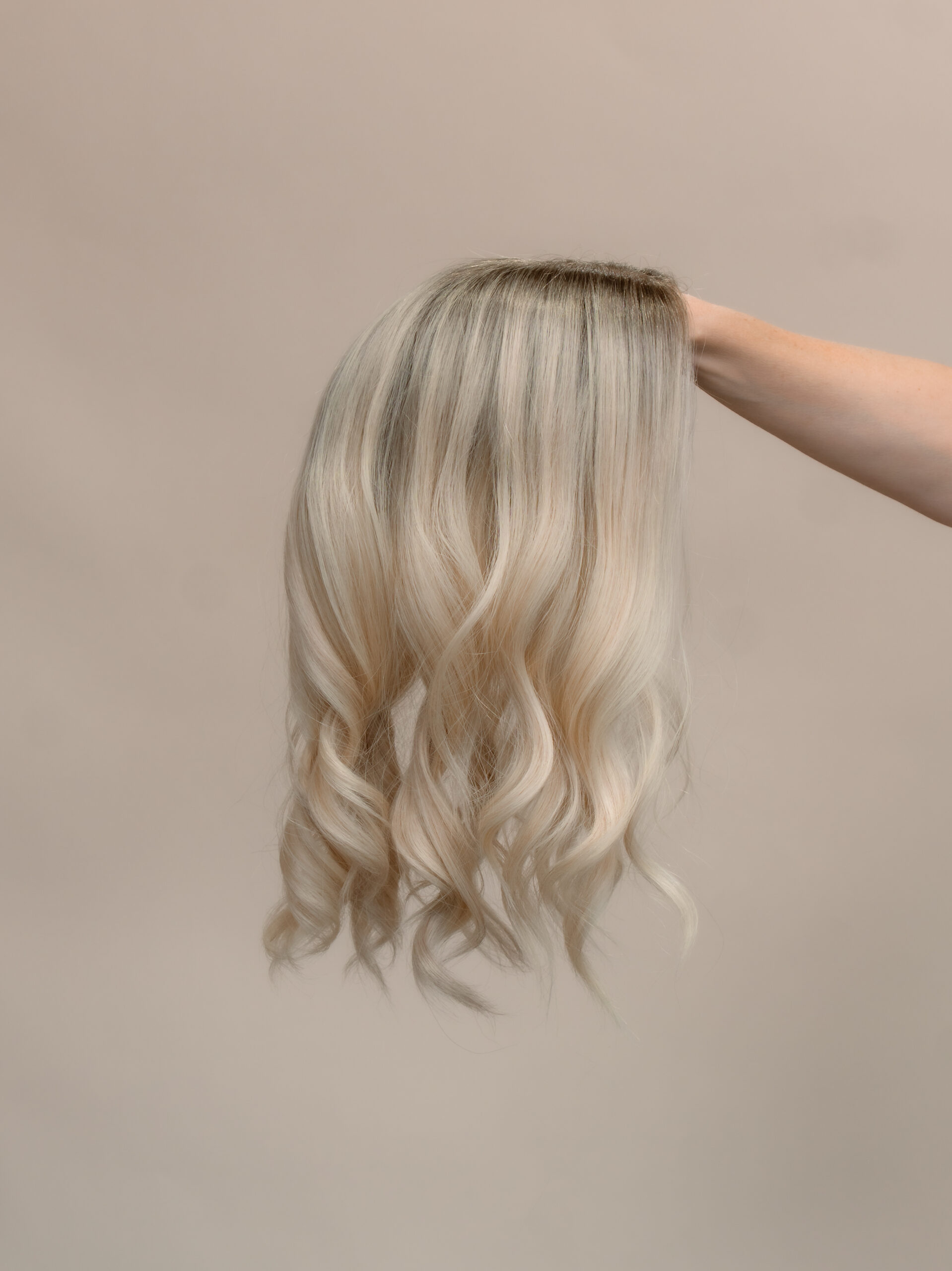 A topper is an extension that clips on to the top of your head adding volume and length. The exact same cap style as our classic silk toppers, except the silk area is a lightweight lace material. This topper is easier for people with less hair at the hairline to blend as it sit very flat. The 100% hand tied lace is multi directional so you can comfortably part the hair anywhere on the top (Yes, you can do a side part!). The stretchy wefts at the back are light weight and breathable, they comfortably mould over your head helping the topper to sit very flat. and seamlessly blend with your own hair. The pressure sensitive clips ensure the topper is very secure, without pulling your own hair. 2 flat combs at the front to ensure the topper sits very flat and seamlessly blends with your own hair. Professionally cut and styled this beautiful topper is ready to wear straight out of the box! Low density for natural coverage (110%). Length measured from crown to tip with slight layers. Made from beautiful human hair, it will air dry straight and can be styled any way you like with hot tools.If you decide that your piece will not work for you, Goldylost Hair accepts returns on all stock wigs and hair toppers purchased online, this includes pre-orders. Read the full Returns Policy.
