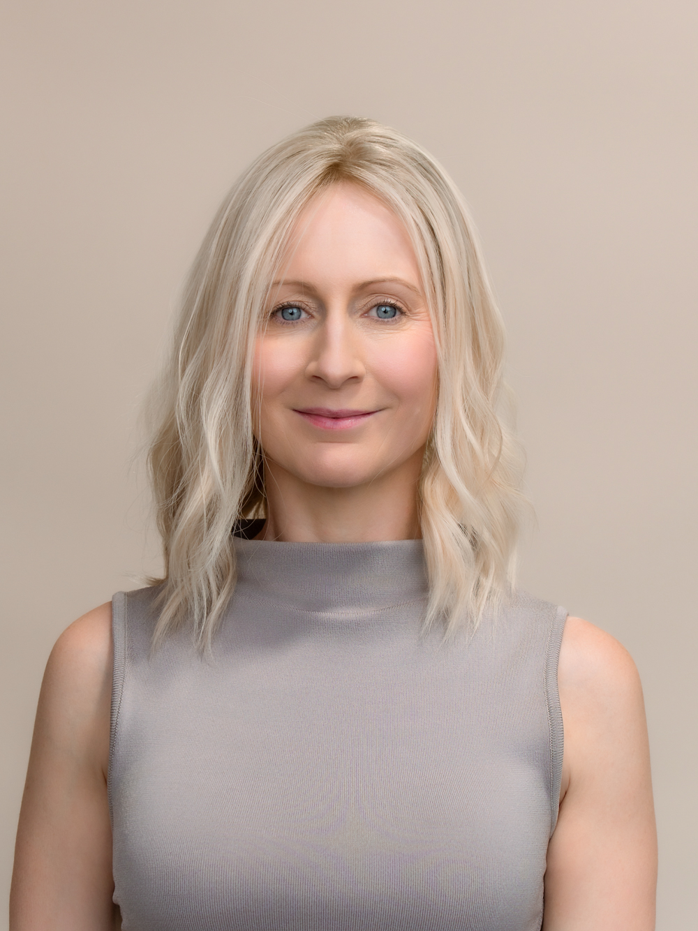 Pale Creamy blonde with very subtle root.