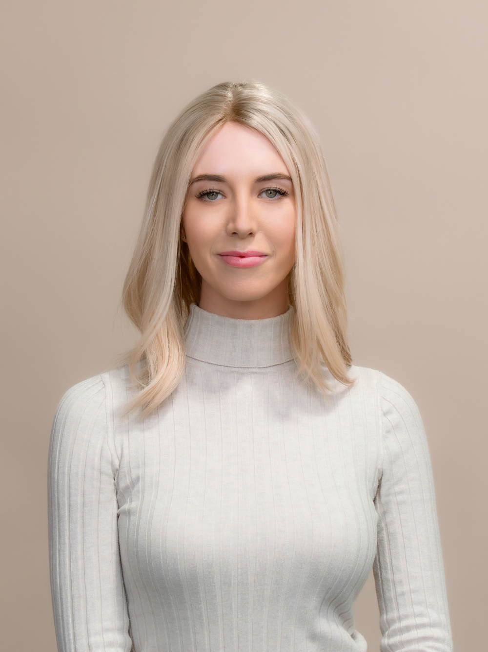Pale Creamy blonde with very subtle root.