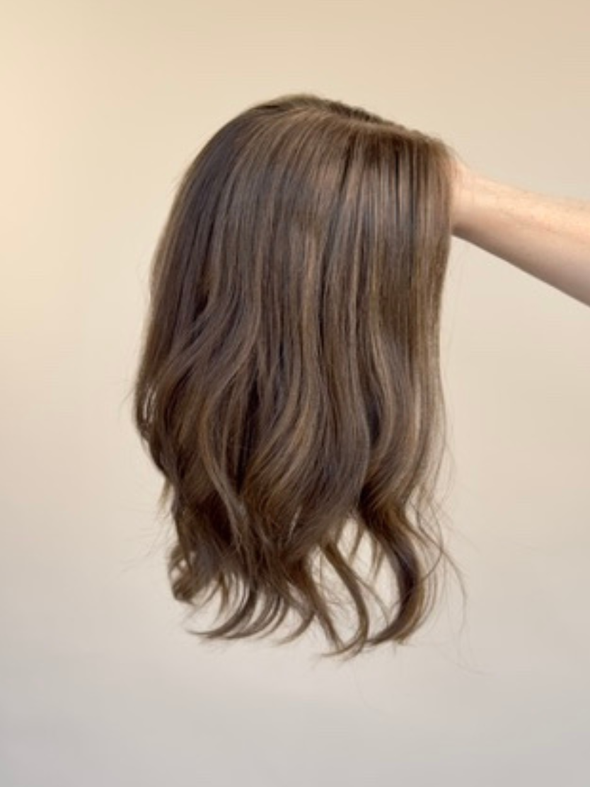 A topper is an extension that clips on to the top of your head adding volume and length. The exact same cap style as our classic silk toppers, except the silk area is a lightweight lace material. This topper is easier for people with less hair at the hairline to blend as it sit very flat. The 100% hand tied lace is multi directional so you can comfortably part the hair anywhere on the top (Yes, you can do a side part!). The stretchy wefts at the back are light weight and breathable, they comfortably mould over your head helping the topper to sit very flat. and seamlessly blend with your own hair. The pressure sensitive clips ensure the topper is very secure, without pulling your own hair. 2 flat combs at the front to ensure the topper sits very flat and seamlessly blends with your own hair. Professionally cut and styled this beautiful topper is ready to wear straight out of the box! Low density for natural coverage (110%). Length measured from crown to tip with slight layers. Made from beautiful human hair, it will air dry straight and can be styled any way you like with hot tools.If you decide that your piece will not work for you, Goldylost Hair accepts returns on all stock wigs and hair toppers purchased online, this includes pre-orders. Read the full Returns Policy.