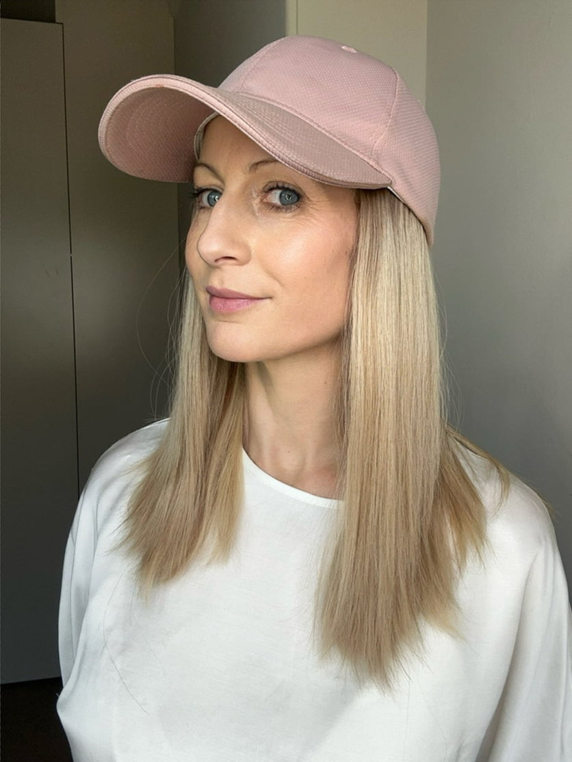 The hat wig is created without hair on the top, so it can easily be worn under your favourite hat. The top area is a breathable, lightweight material which is more durable than a lace top wig.