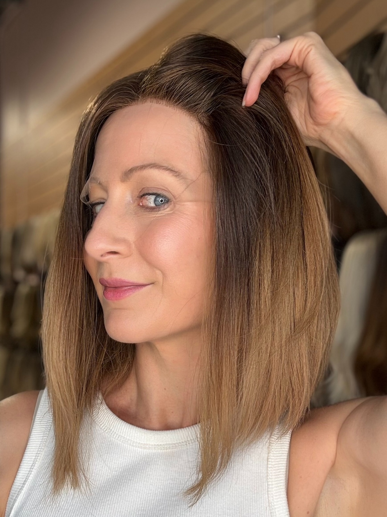 GoldyLost Hair wigs are comfortable, natural caps that cover all of your own hair. They allow you to wear any hair colour or length you desire. This lace top wig made from high quality remy human hair, is lightweight, breathable and incredibly natural looking. The transparent lace blends into your skin, and the hair looks like it is growing from your own head. The ear to ear lace with small knots gives an incredibly natural hair line and the lace top is 100% hand tied allowing you to comfortably part the hair anywhere on the top (yes, you can do a side part!). It has stretchy wefts at the back to comfortably mould over your head and an adjustable band for the perfect fit. A fine silk material under the lace gives the illusion of a natural scalp and 2 pressure sensitive clips on the ear tabs and a comb at the nape for extra security (easily removed if preferred). Density: Low density (110%) Length measured from crown to tip with layers. Made from beautiful human hair, it will air dry straight and can be styled any way you like with hot tools. Professionally cut, coloured and styled as per the photo, this beautiful wig is ready to wear straight out of the box!