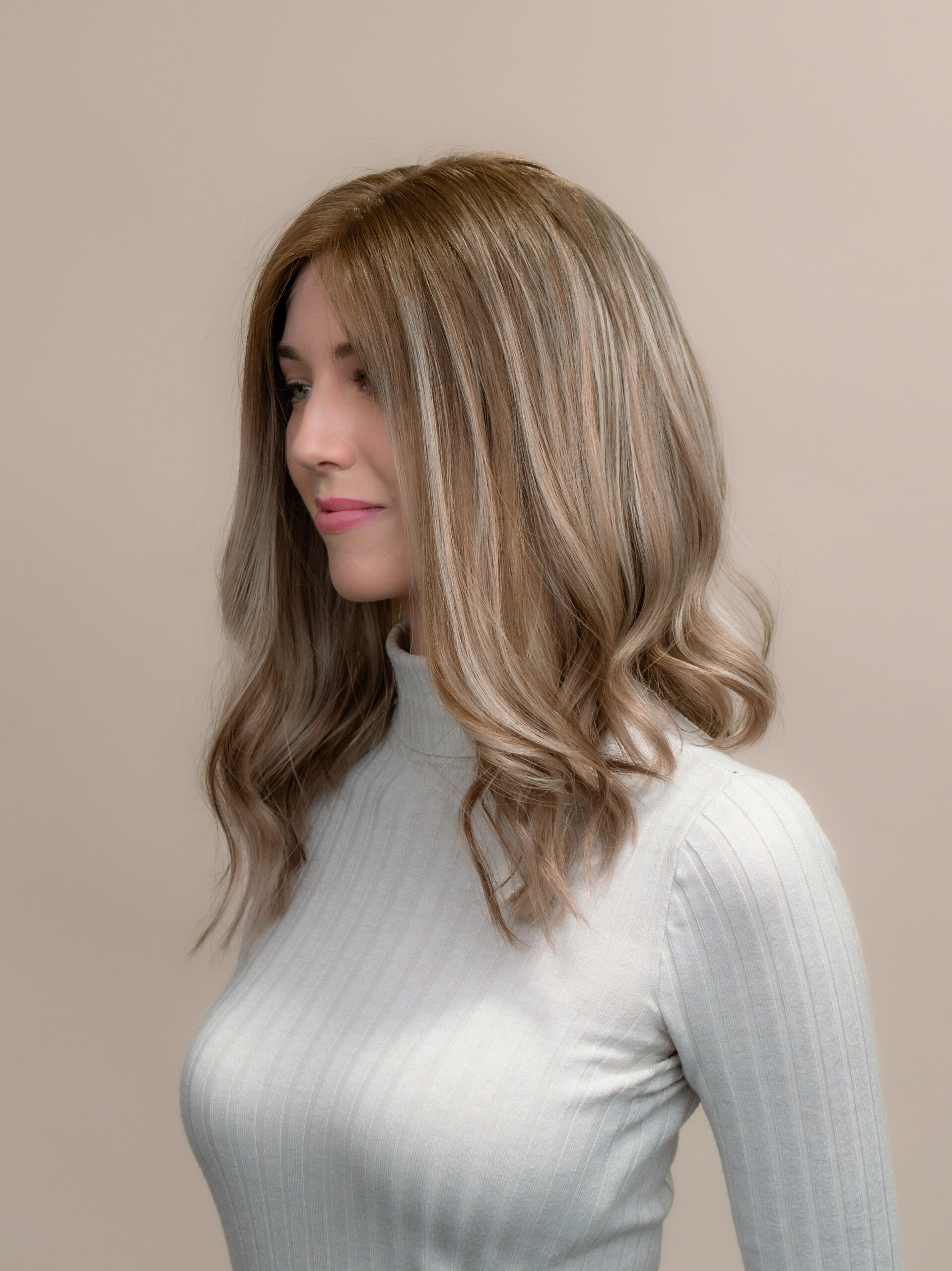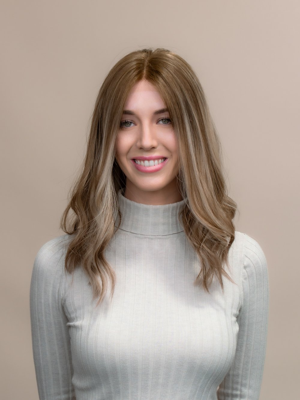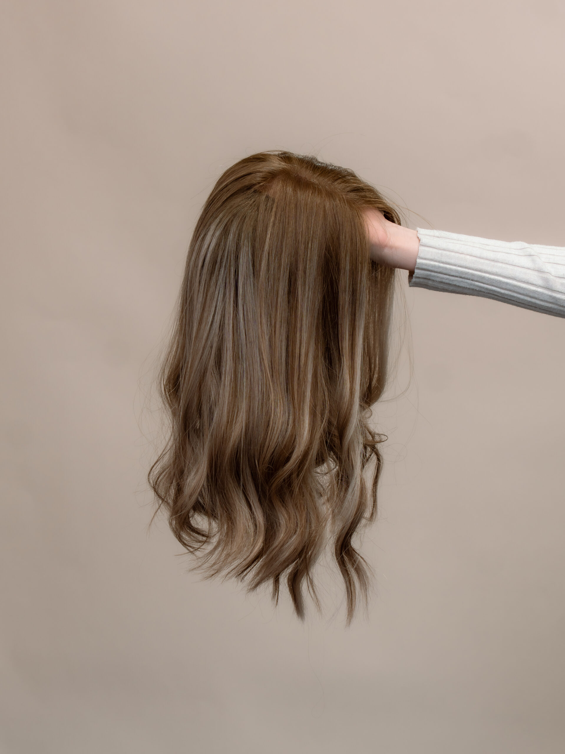This dimensional brunette features a seamless blend of rich brunette tones, softly layered with fine highlights to add movement and light. The subtle rooting enhances the natural appearance, offering a soft transition that mimics real hair growth.