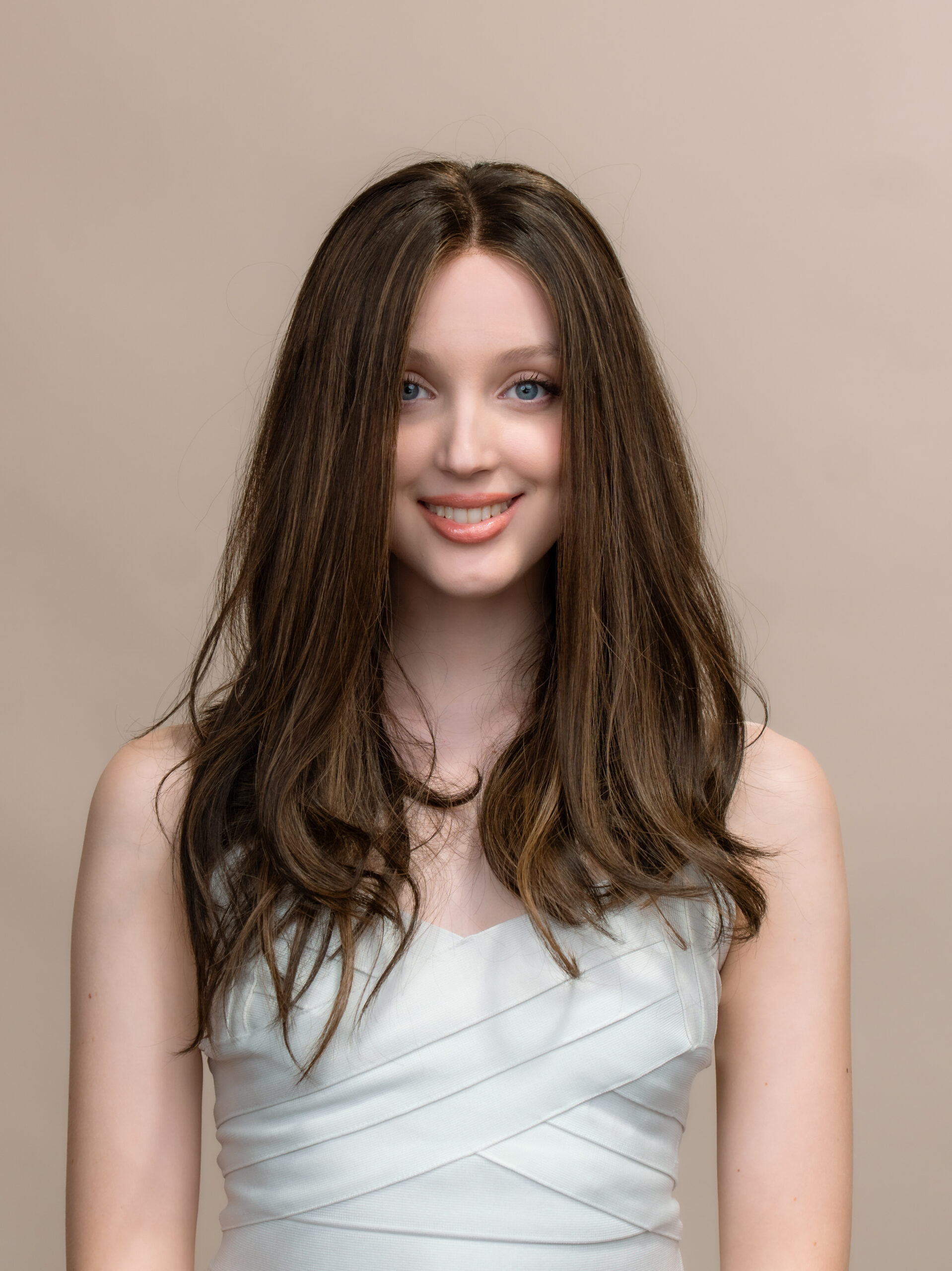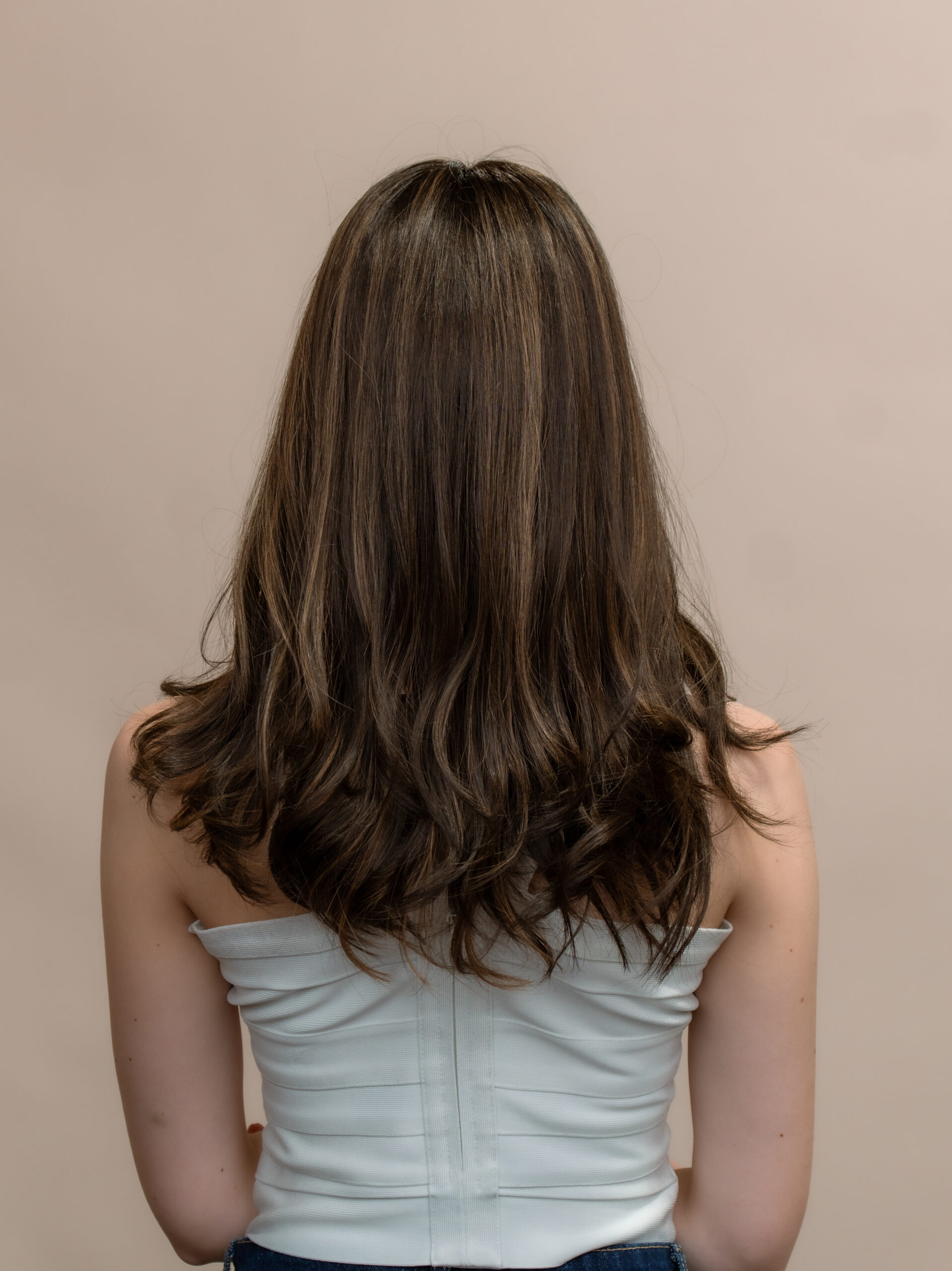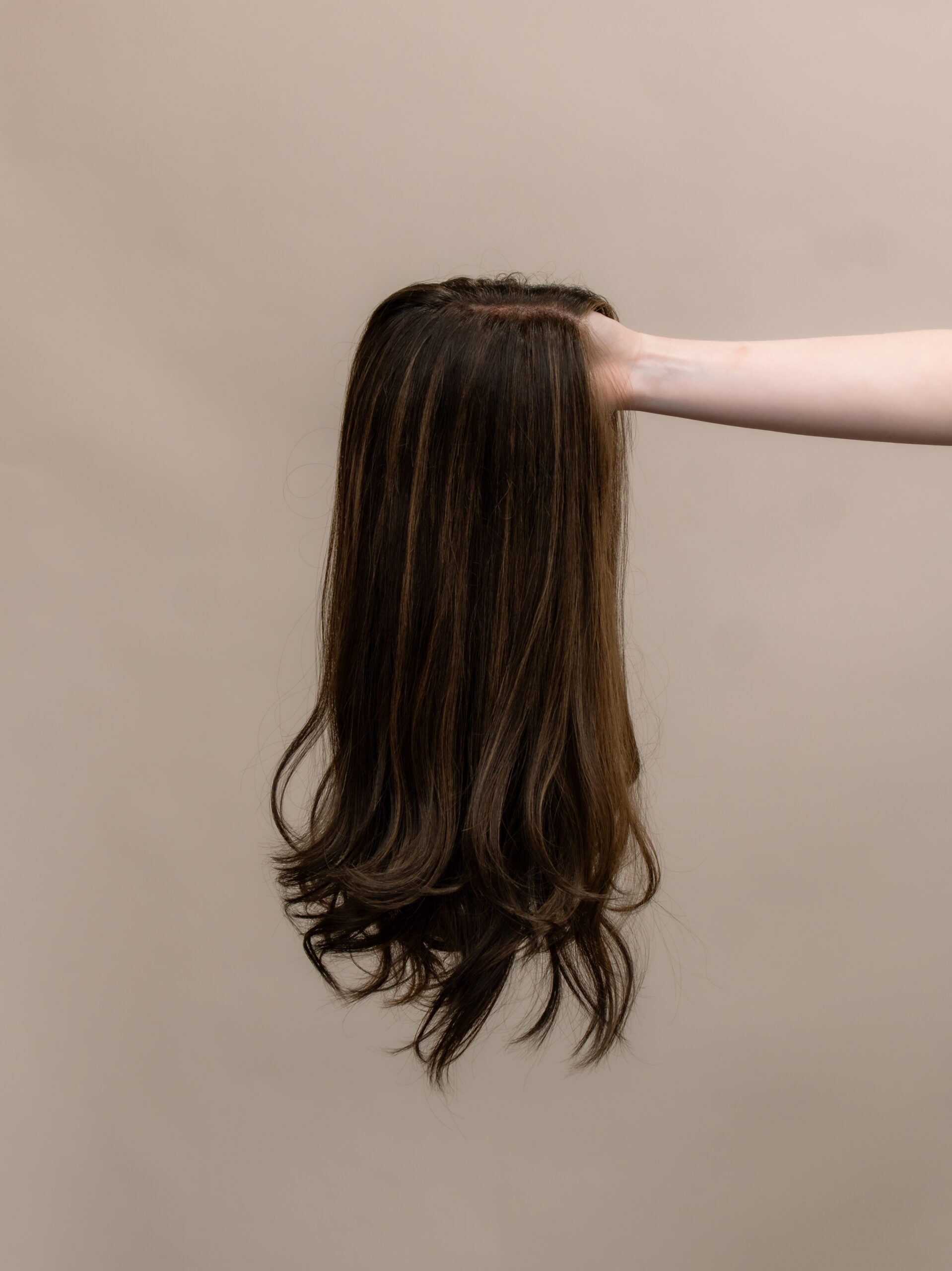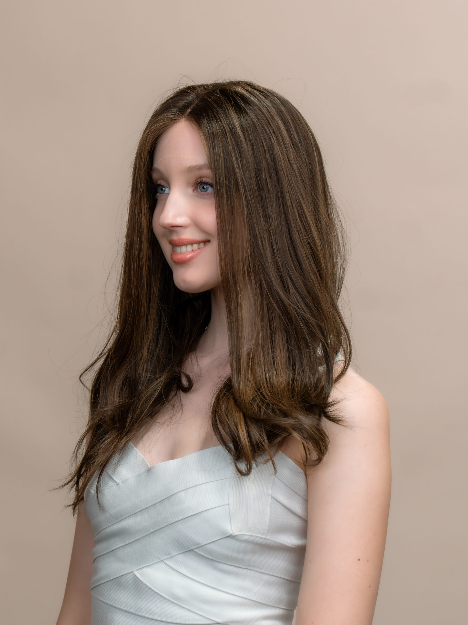 A deep cool brunette base softly brightened with fine blonde highlights for natural dimension and contrast. The lace top wig offers a realistic hairline, lightweight comfort, and versatile styling. Made from premium remy human hair, it can be worn straight or styled with hot tools — beautifully natural and ready to wear.