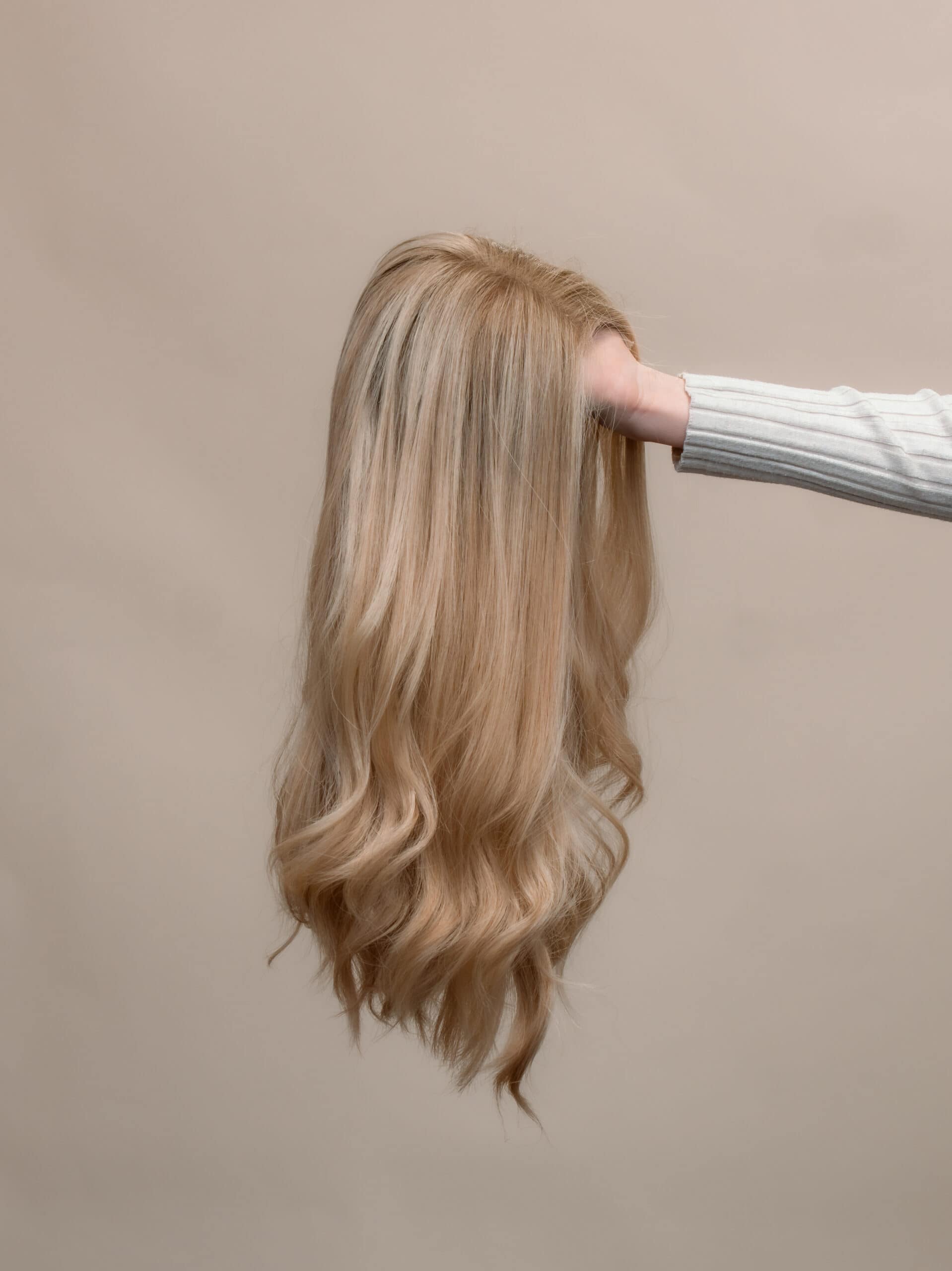 A rich honey blonde with golden undertones and creamy highlights for a soft, radiant finish. This medium-density lace top wig offers natural brightness, depth, and movement, with a luminous look that flatters a wide range of skin tones.