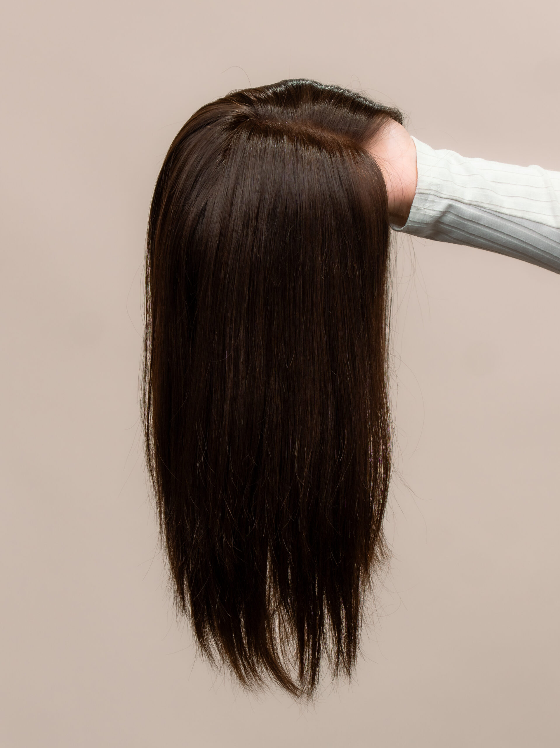 Deep, rich virgin brunette hair with soft warm undertones for natural radiance and dimension. The fully hand-tied cap provides a featherlight, breathable fit and natural movement. Made from premium virgin human hair, it air dries straight and can be styled with hot tools — luxurious, warm, and beautifully natural.