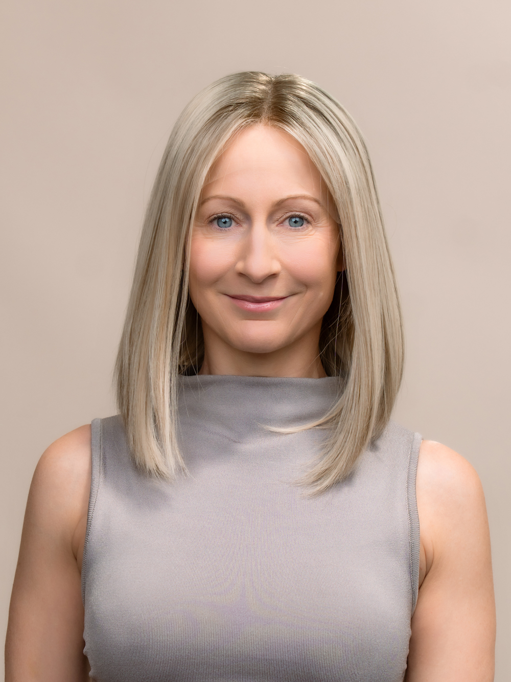 A soft, lived-in dirty blonde wig with a cool ash-matte root and subtle baby lights for brightness. This low-density lace top style blends seamlessly with delicate tones and natural depth, offering a modern, sun-kissed look in a classic bob length.