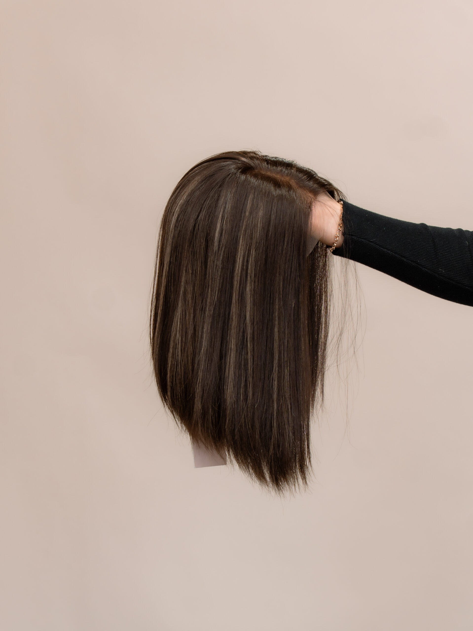A warm brunette human hair wig with a golden brown base and delicate highlights for a radiant, multi-dimensional glow. Lightweight, natural-looking, and beautifully soft.