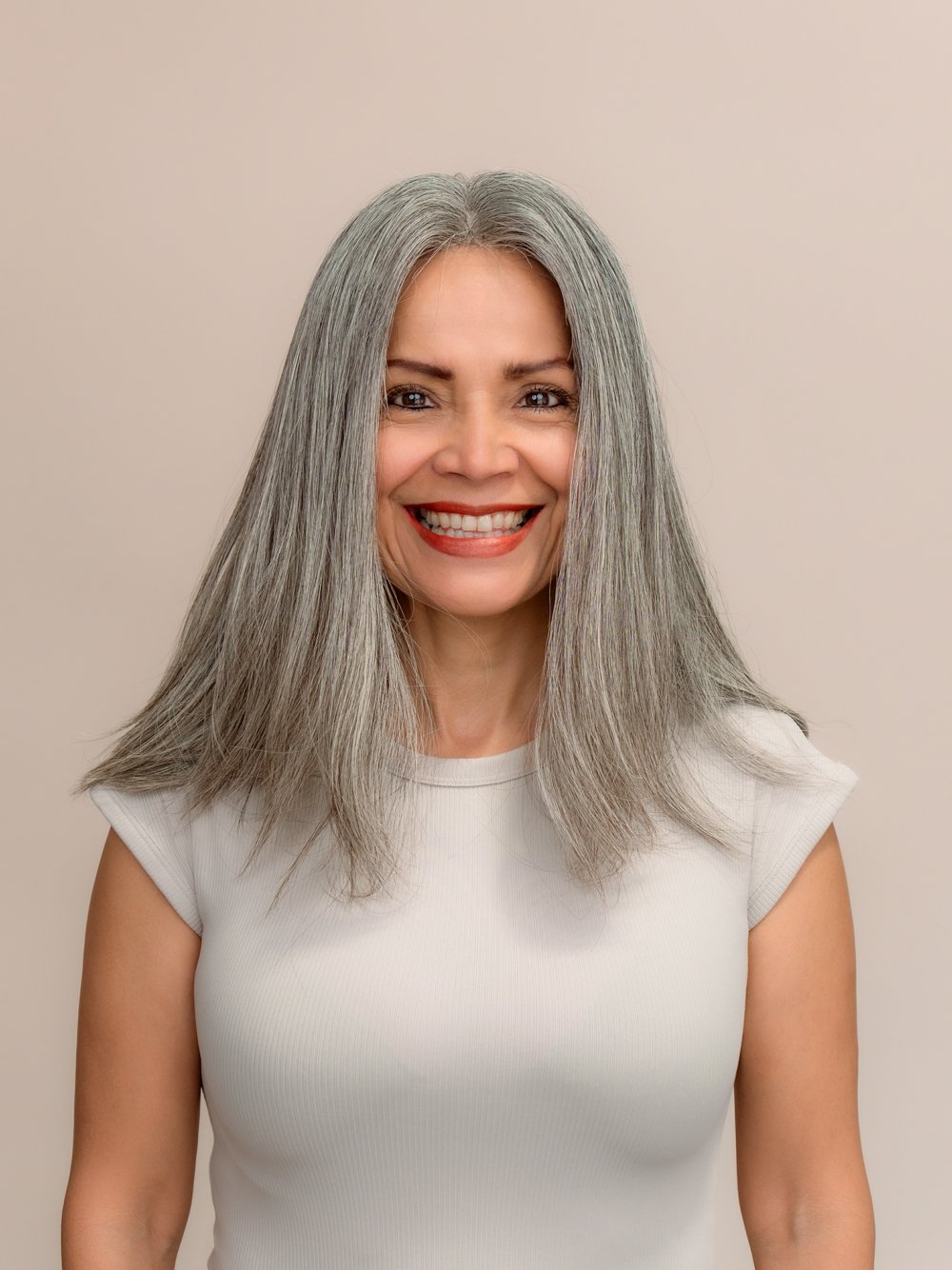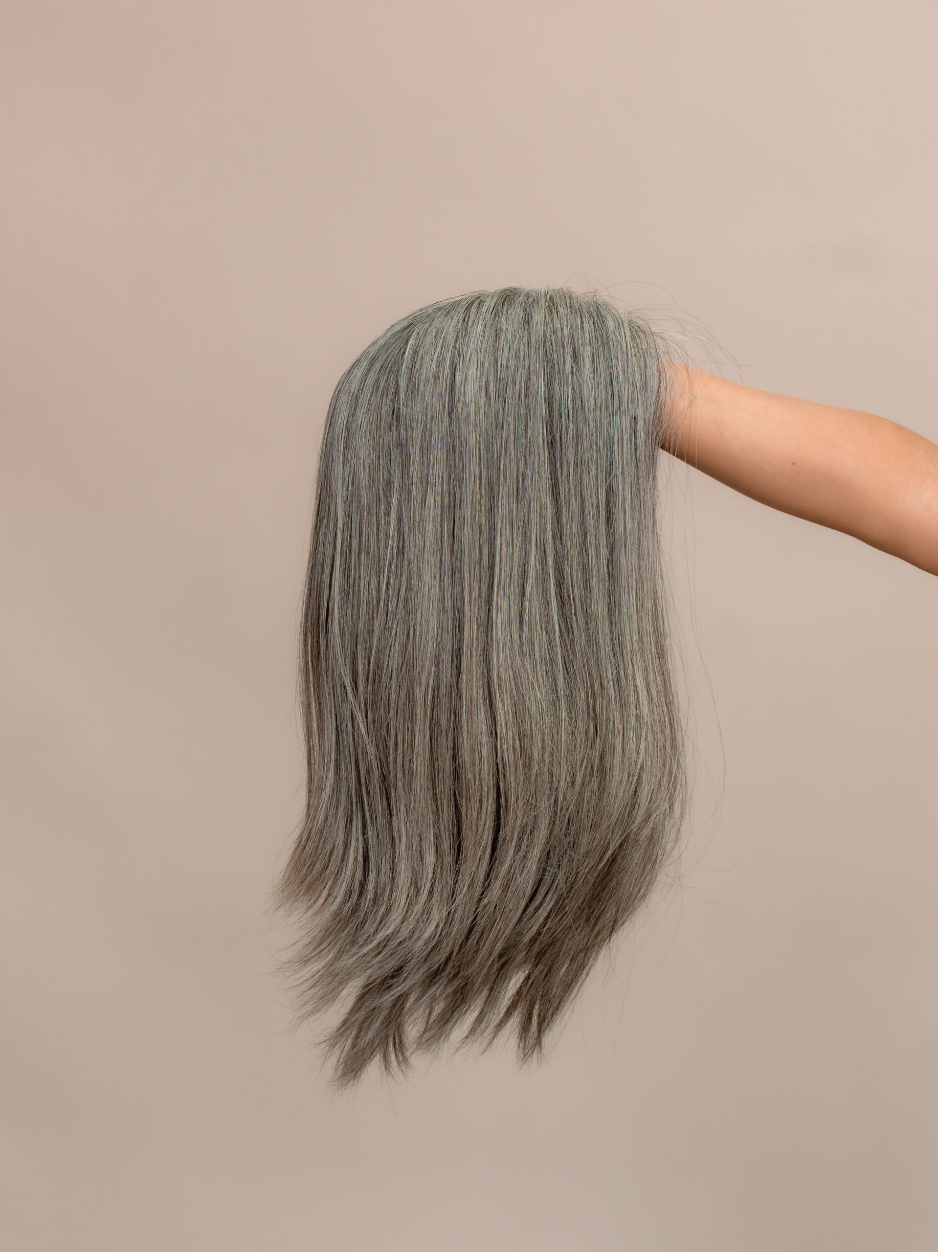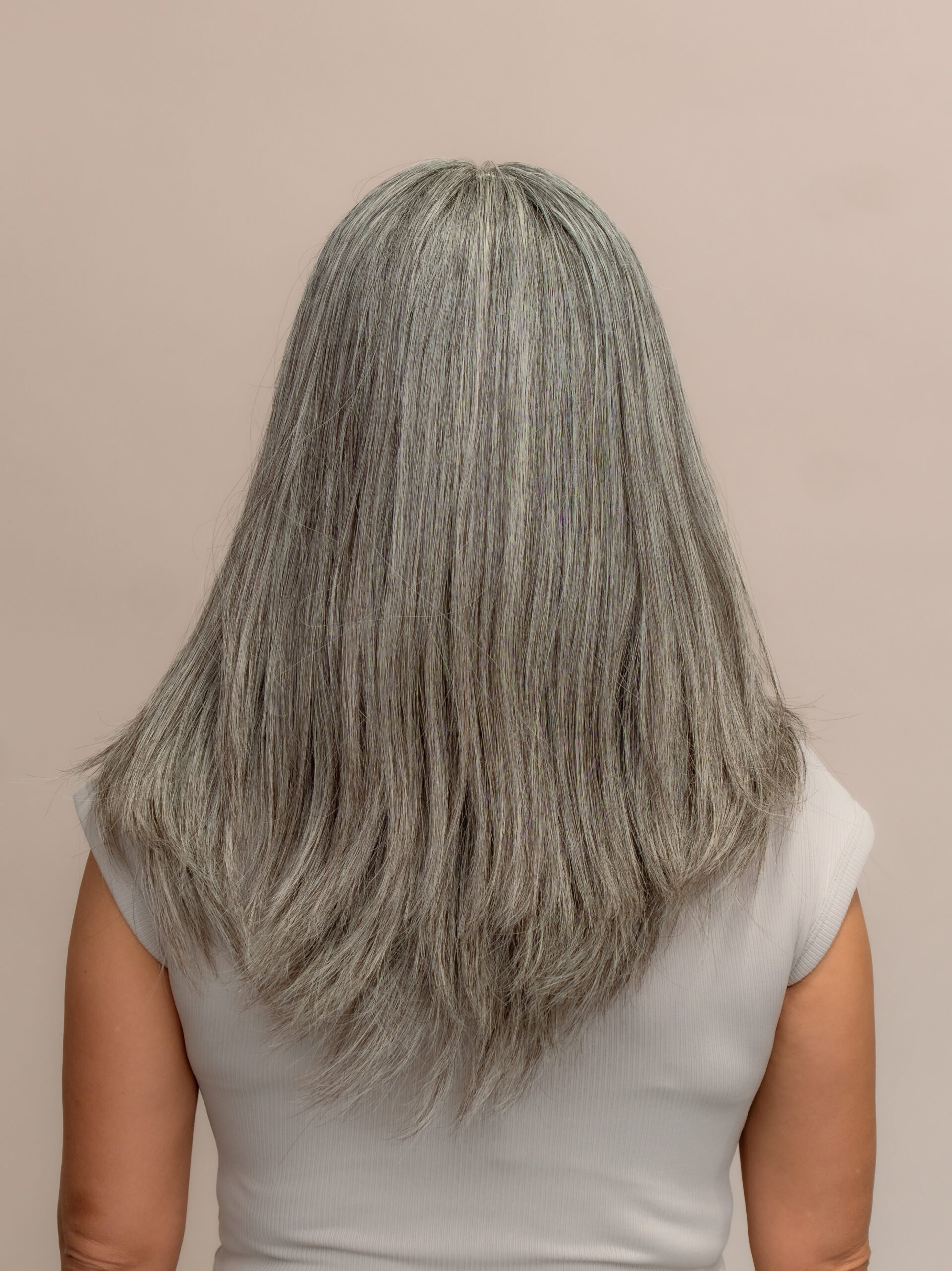 This shade is a classic, natural grey with a balanced blend of cool steel tones. With more salt (lighter grey) than pepper (deeper strands), it creates a soft, diffused look that mimics naturally greying hair. The cool undertones give it a refined, modern feel, while the true salt-and-pepper mix adds depth and dimension, resulting in an effortlessly authentic, sophisticated grey.