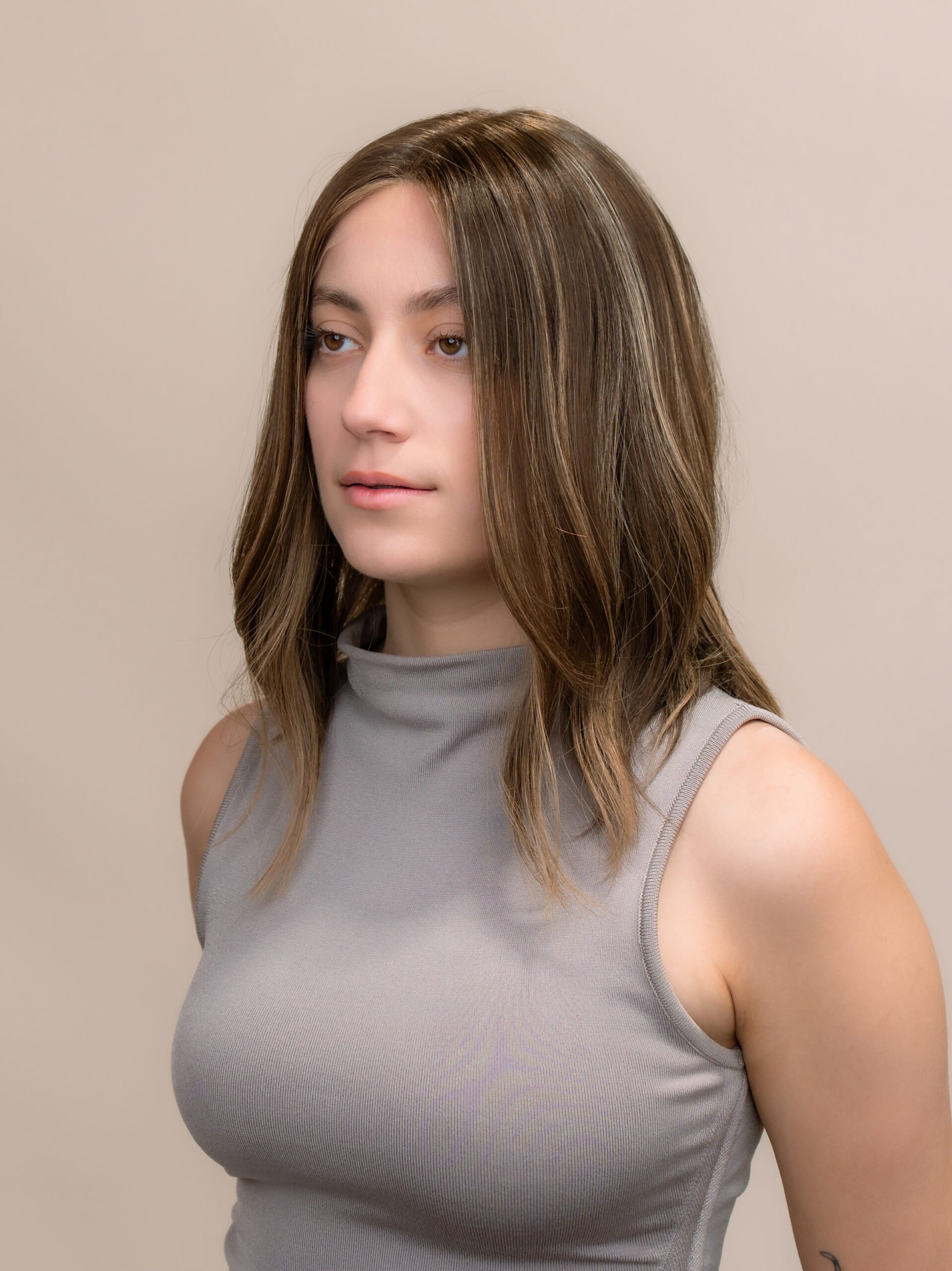 A neutral-cool brunette human hair wig featuring soft mushroom tones and airy ash-beige ribbons. Lightweight, low-density, and naturally dimensional for a refined, luminous finish.