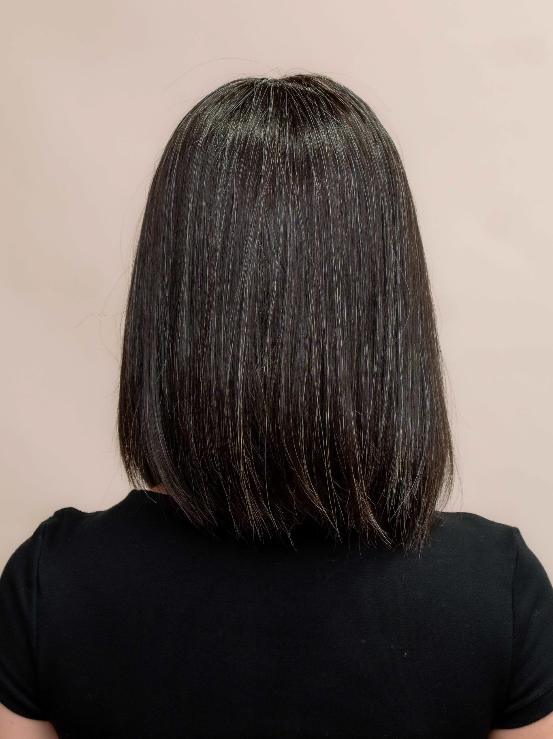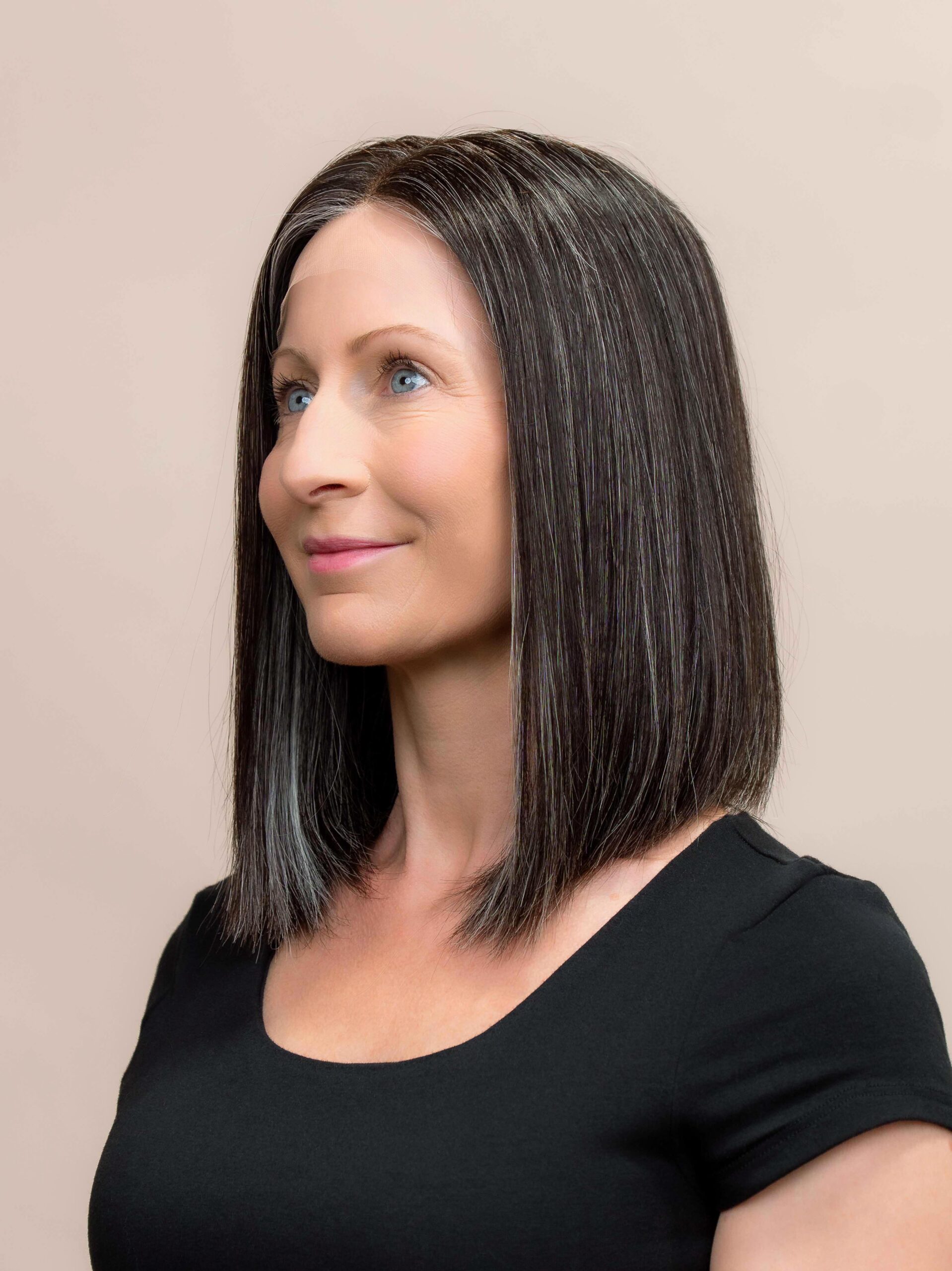 A striking blend of deep espresso brown with cool charcoal undertones, softly woven with natural silver streaks through the front and crown. The face-framing silver highlights create a flattering, dimensional look that mimics natural greying with elegance and grace. Perfect for those embracing their silver journey with style and confidence.